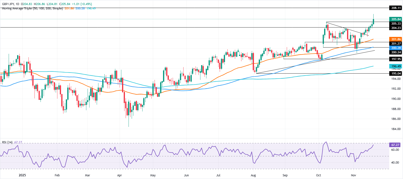 Giao dịch GBP/JPY duy trì đà tăng ngày thứ tư liên tiếp, dù vẫn dưới 206.00 sau khi thiết lập đỉnh năm mới tại 206.86 vào thứ Năm. Tại thời điểm viết bài, cặp tiền giao dịch ở 205.85, tăng 0.49%.