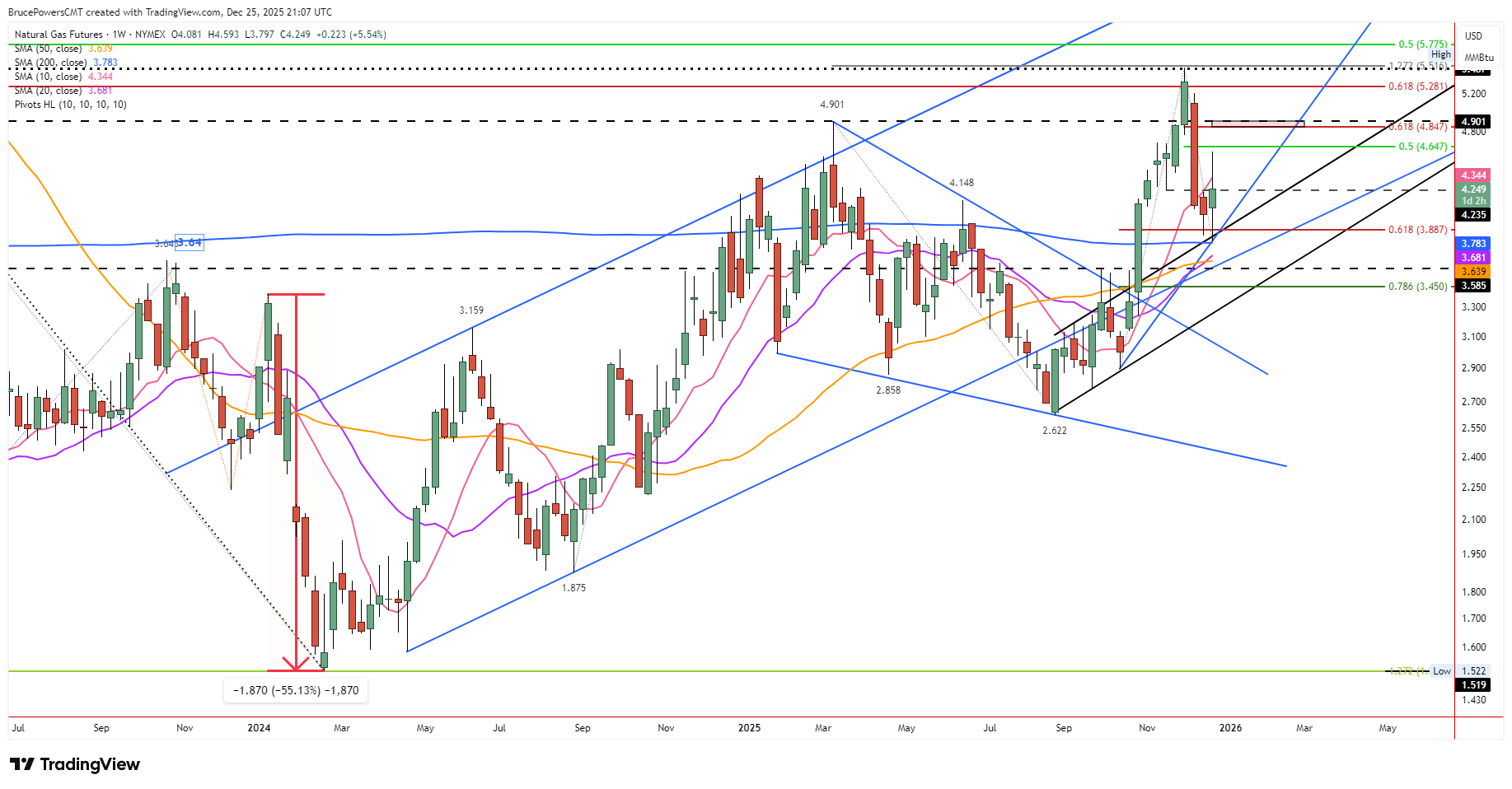 Do kỳ nghỉ Giáng sinh, biểu đồ khung tuần được sử dụng để đánh giá xu hướng. Một điểm đáng chú ý là phản ứng giá tại đường trung bình động 200 khung tuần. Trước đó, đường này từng đóng vai trò kháng cự tại đỉnh dao động tháng Sáu và hiện đang bắt đầu thể hiện vai trò hỗ trợ, thậm chí còn mạnh hơn trên khung thời gian tuần. Đáng chú ý, đường trung bình 200 khung tuần tại $3.78 nằm rất gần vùng hỗ trợ được xác nhận bởi đường trung bình 50 tháng. Khi kháng cự cũ chuyển thành hỗ trợ, xu hướng thường sẵn sàng tiếp diễn. Với vàng, hiện tượng này phản ánh quá trình phục hồi ngược xu hướng được kích hoạt vào thứ Ba, với tín hiệu đảo chiều tăng được xác nhận thông qua mức đóng cửa cao nhất trong tám ngày.