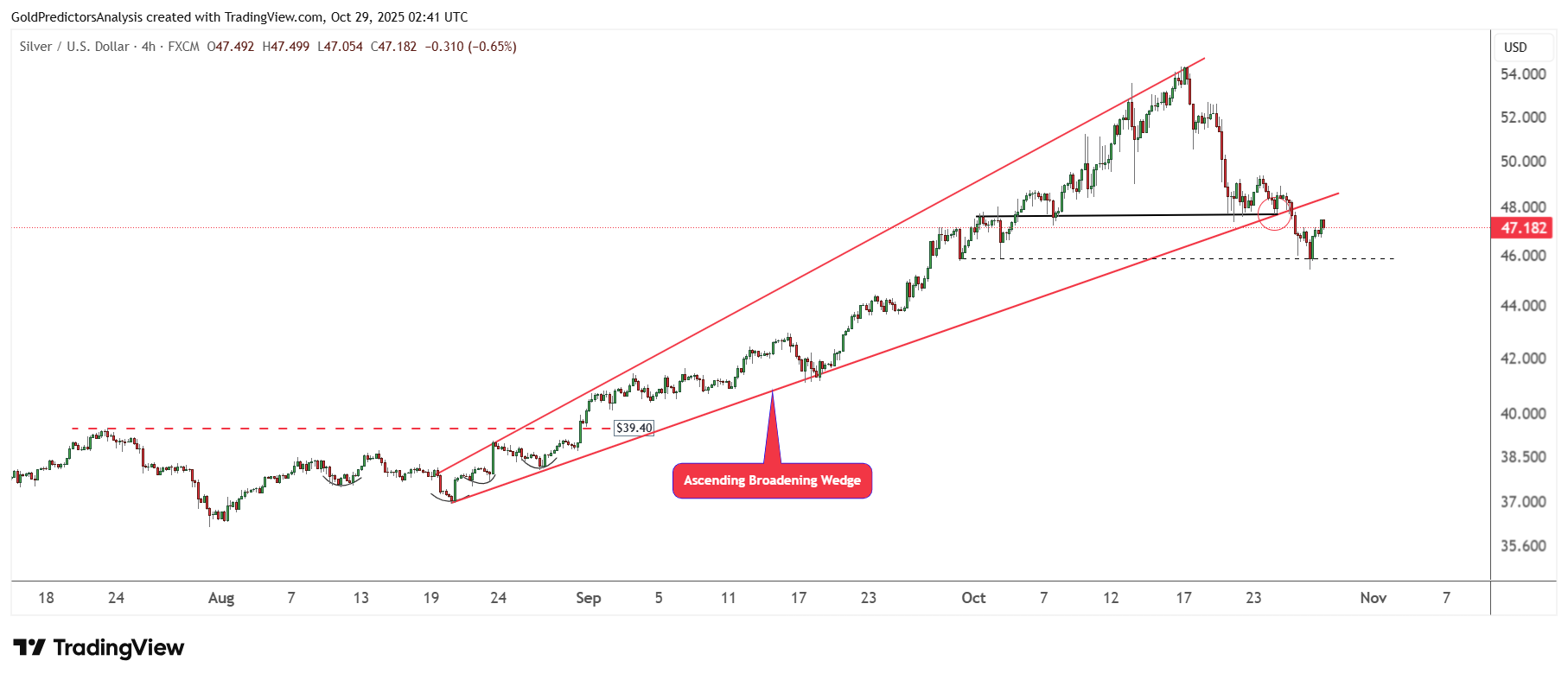 Biểu đồ khung 4 giờ cho bạc giao ngay cũng cho thấy giá đã phá vỡ dưới vùng hỗ trợ 47.60 USD – đáy của mô hình nêm mở rộng tăng dần. Sau cú giảm này, bạc bật tăng từ hỗ trợ mạnh tại 45.80 USD, trùng với đường xu hướng chấm đen. Sau nhịp phục hồi, giá hiện đang trong giai đoạn đi ngang chờ tín hiệu rõ ràng. Nếu phá vỡ trên vùng 49 USD, giá có thể bứt phá mạnh; ngược lại, nếu xuyên thủng 45,80 USD, xu hướng giảm có thể mở rộng về vùng 45 USD.