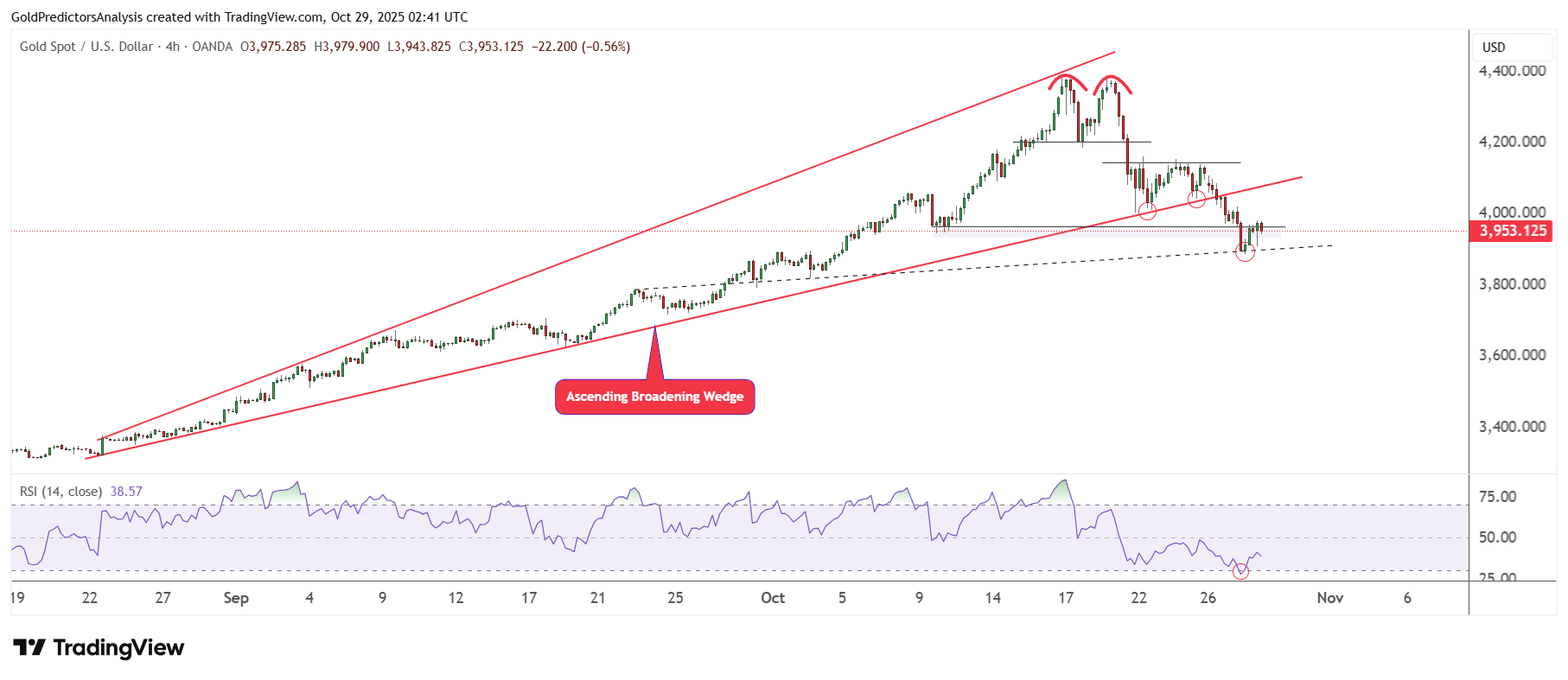 Biểu đồ khung 4 giờ cho vàng giao ngay cho thấy giá đã phá vỡ dưới vùng hỗ trợ 4,000 USD – ngưỡng từng đóng vai trò biên dưới của mô hình nêm mở rộng tăng dần.