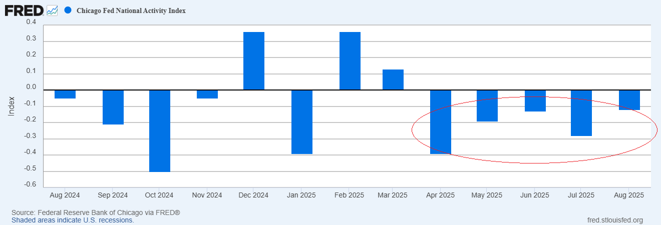 Chỉ số Hoạt động Quốc gia của Fed Chicago đã duy trì trong vùng âm kể từ tháng 4 năm 2025, cho thấy sản lượng kinh tế Mỹ đang yếu đi rõ rệt. Đà suy giảm kéo dài này phản ánh mức độ giảm tốc của nền kinh tế nói chung, bất chấp các tiêu đề lạc quan về thị trường chứng khoán và đàm phán thương mại.