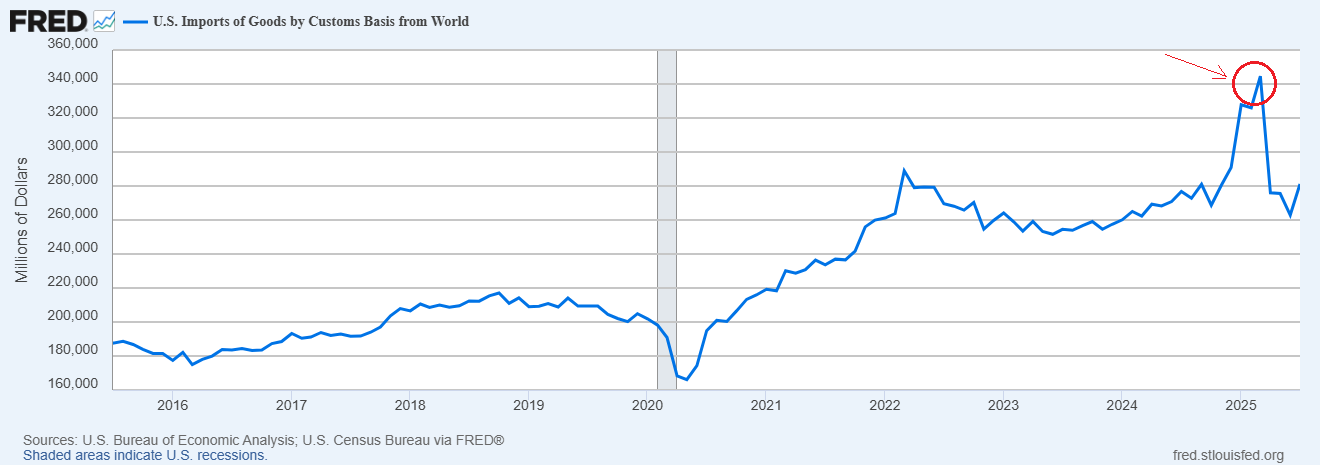 Biểu đồ dưới đây cho thấy nhập khẩu của Mỹ tăng mạnh trong quý I/2025 khi các doanh nghiệp gấp rút tích trữ hàng hóa trước khi mức thuế mới có hiệu lực. Tuy nhiên, nhập khẩu tăng trở lại vào tháng 7/2025, cho thấy dù hoạt động tích trữ diễn ra sớm hơn, nhu cầu nội địa Mỹ vẫn ổn định.