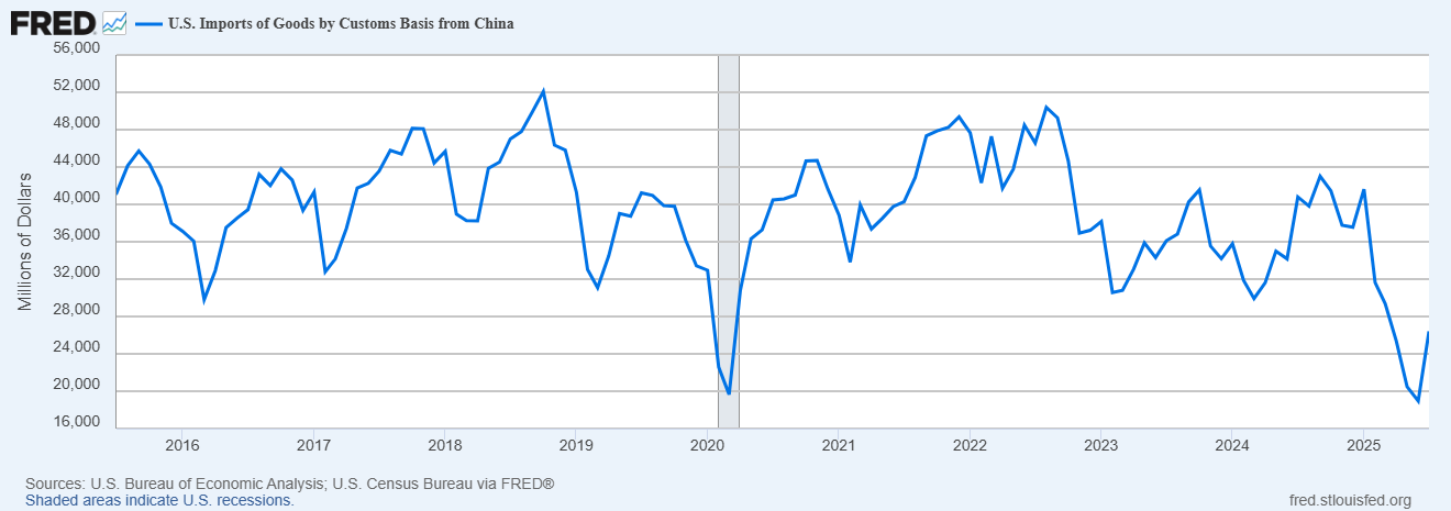 Ngược lại, nhập khẩu từ Trung Quốc biến động mạnh. Lượng hàng nhập tăng trong tháng 1 nhưng giảm sâu trong các tháng sau đó, ngay sau khi Tổng thống Trump tuyên bố áp thuế. Sự sụt giảm kéo dài suốt quý II/2025, nhưng đến tháng 7 đã phục hồi lên 26,4 tỷ USD nhờ việc tạm dừng áp thêm thuế. Những biến động này càng làm gia tăng bất ổn trong hệ thống thương mại toàn cầu.