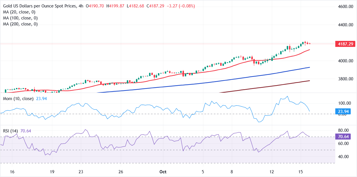 Vàng giao ngay đã vượt mốc 4,200 USD vào thứ Tư, đánh dấu mức đỉnh mọi thời đại mới. Cặp XAU/USD đạt đỉnh tại 4,218.22 USD trong đầu phiên châu Âu, hiện đang được giao dịch quanh 4,190.00 USD. Nhu cầu tìm kiếm tài sản an toàn tiếp tục gia tăng trong bối cảnh chính phủ Hoa Kỳ bước sang tuần thứ ba của tình trạng đóng cửa. Thượng viện Mỹ vẫn chưa thể thông qua dự luật tài trợ tạm thời vào thứ Ba, và dù các cuộc đàm phán vẫn diễn ra, không có dấu hiệu cho thấy tiến triển nào hướng tới một thỏa thuận.