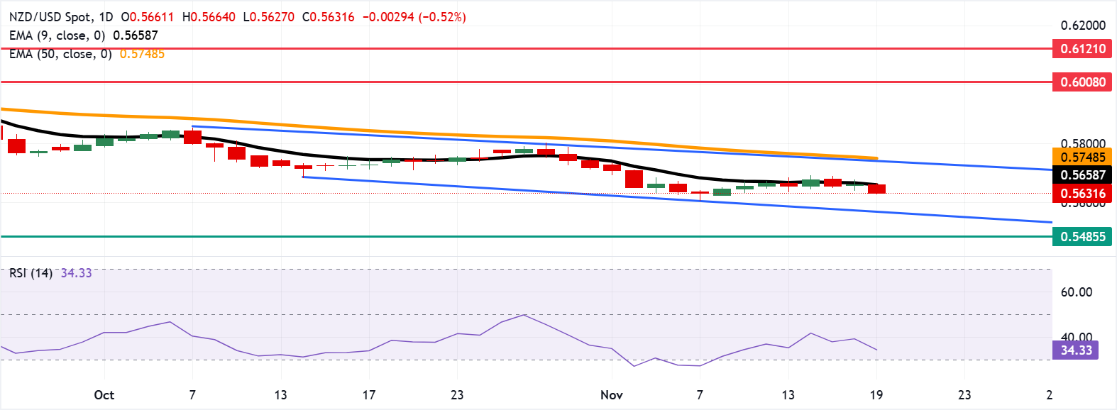 NZD/USD giảm hơn 0.5% sau khi tăng nhẹ trong phiên trước, giao dịch quanh 0.5630 trong giờ châu Âu thứ Tư. Phân tích kỹ thuật khung ngày cho thấy xu hướng giảm kéo dài khi giá vẫn nằm trong kênh giảm.
