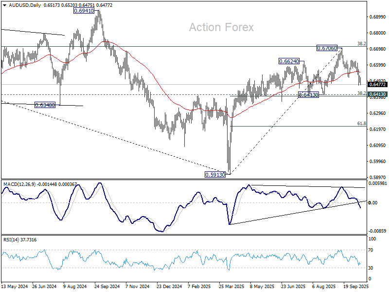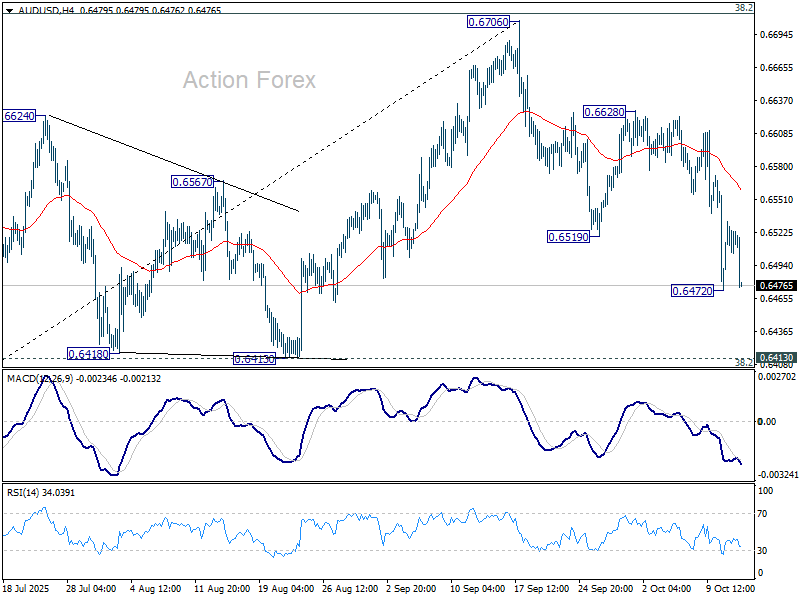 AUD/USD giảm mạnh trong hôm nay nhưng vẫn duy trì trên mức đáy tạm thời 0.6472. Xu hướng trong ngày vẫn trung tính và có thể thấy thêm các nhịp tích lũy. Tuy nhiên, rủi ro vẫn nghiêng về phía giảm miễn là mức kháng cự 0.6628 được giữ vững. Diễn biến hiện tại cho thấy giá bị từ chối tại mức kháng cự Fibonacci 0.6713. Nếu phá vỡ xuống dưới 0.6472, AUD/USD sẽ nối lại đà giảm từ 0.6706 về cụm hỗ trợ 0.6413 (mức thoái lui 38,2% của dao động từ 0.5913 lên 0.6706 tại 0.6403).