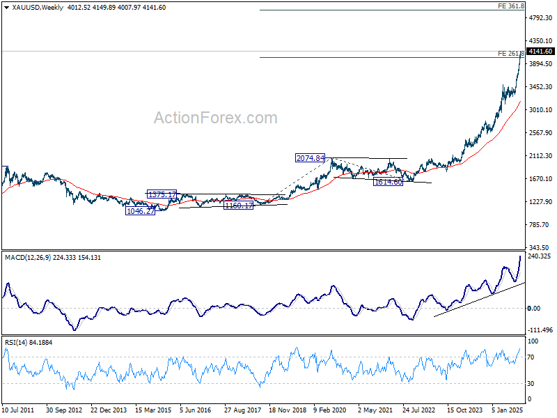 Nhìn rộng hơn, khi vàng đã vượt ngưỡng phóng chiếu 261.8% kẻ từ 1,160.17 lên 2,074.84 từ 1,614.60 tại 4,009.21 USD, kim loại quý này có thể hướng tới mức dự báo 361.8% tại 4,923.87 USD, gần với mốc tâm lý 5,000 USD/oz. Thiết lập kỹ thuật này tương đồng với các điều chỉnh tăng mới nhất từ các dự báo tổ chức.