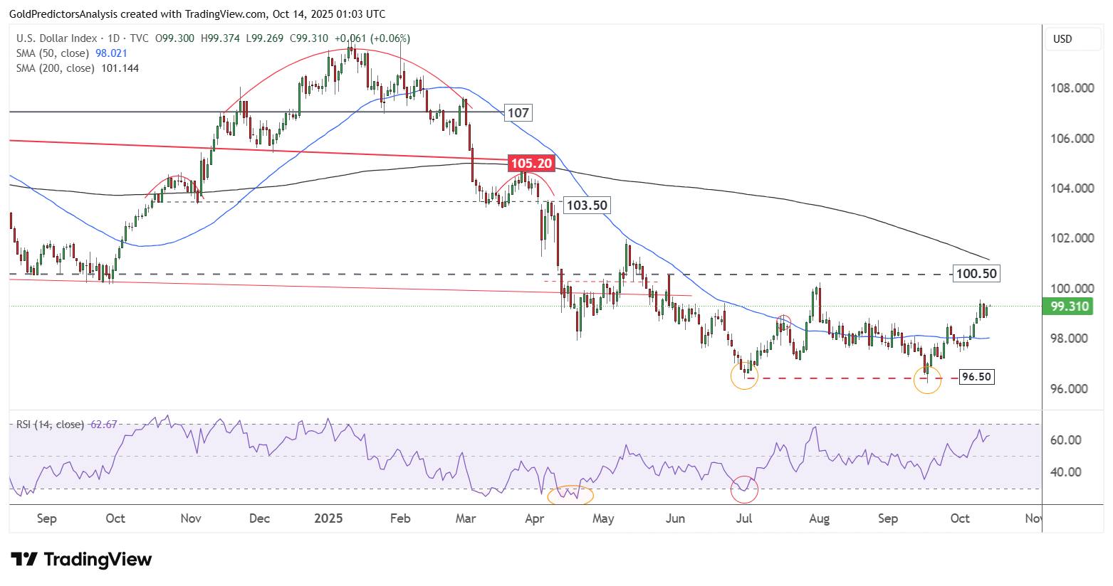 Chỉ số USD (DXY) đang phục hồi từ vùng hỗ trợ dài hạn 96.50, tiến dần về 100.50. Tuy nhiên, miễn là chỉ số vẫn dưới 101.00, xu hướng giảm tổng thể vẫn chưa bị phá vỡ. Dù USD hồi phục, giá vàng (XAU) vẫn tăng mạnh do nhu cầu trú ẩn an toàn trong bối cảnh căng thẳng thương mại gia tăng.