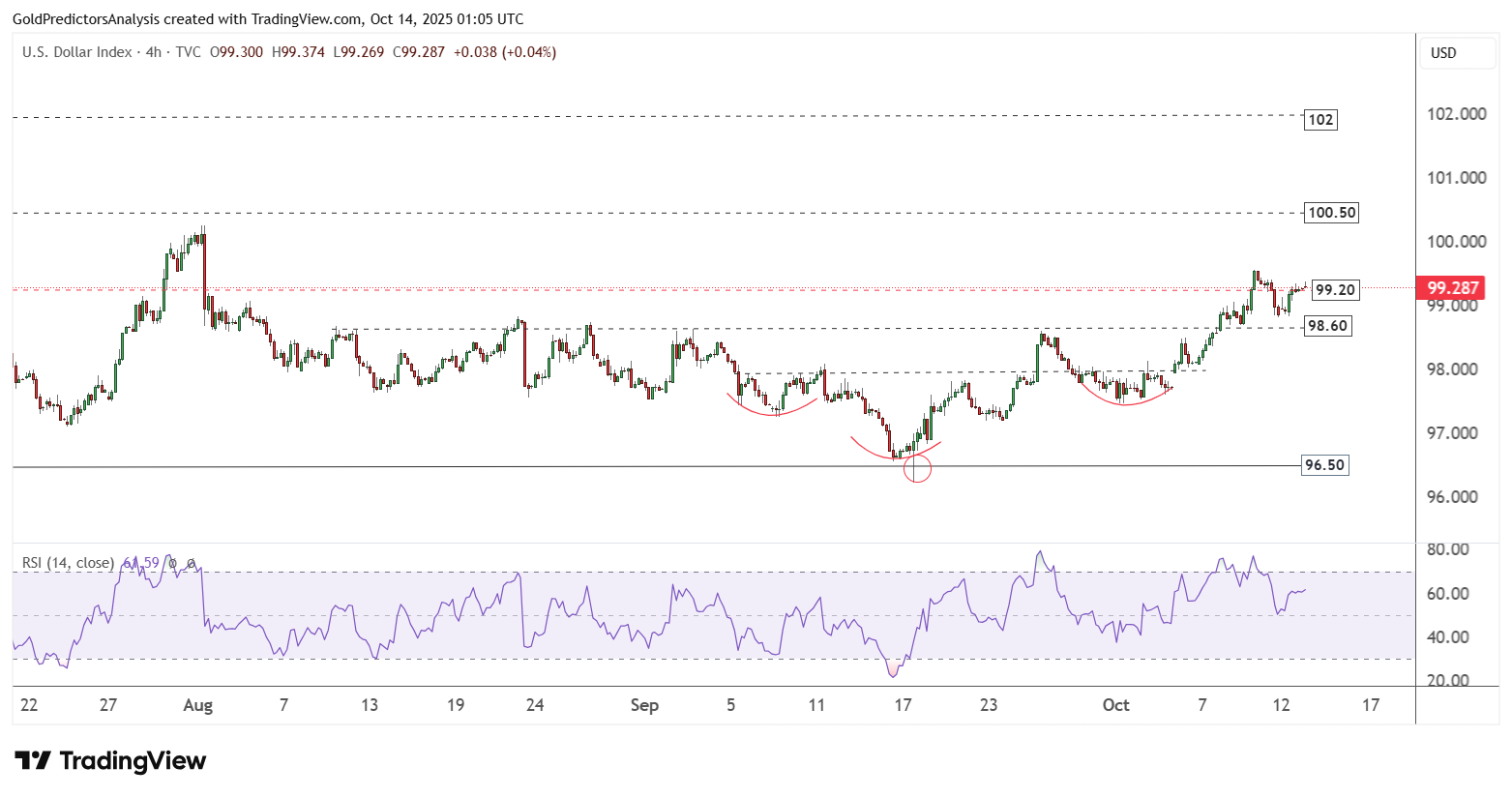 Biểu đồ 4 giờ cho thấy chỉ số DXY đã hình thành mô hình vai-đầu-vai ngược tại vùng hỗ trợ 96.50, báo hiệu triển vọng hồi phục ngắn hạn. Nếu đà tăng tiếp diễn, chỉ số có thể hướng tới vùng 100.50. Tuy nhiên, nếu không thể vượt qua ngưỡng này, xu hướng giảm trung hạn vẫn có thể tiếp tục chiếm ưu thế.