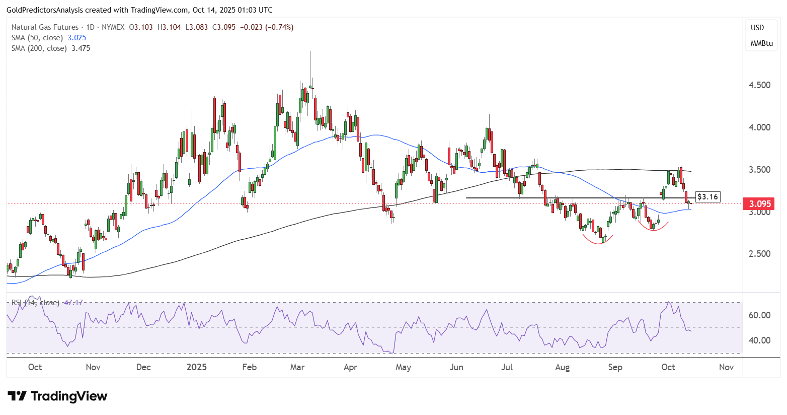Biểu đồ hàng ngày của khí tự nhiên (NG) cho thấy giá đang dao động trong biên độ hẹp giữa đường SMA 50 ngày và SMA 200 ngày, dù đã hình thành mô hình đáy đôi. Việc phá vỡ dưới 3.16 USD cùng chỉ báo RSI vẫn nằm dưới mức trung tính cho thấy động lượng giảm vẫn chiếm ưu thế.