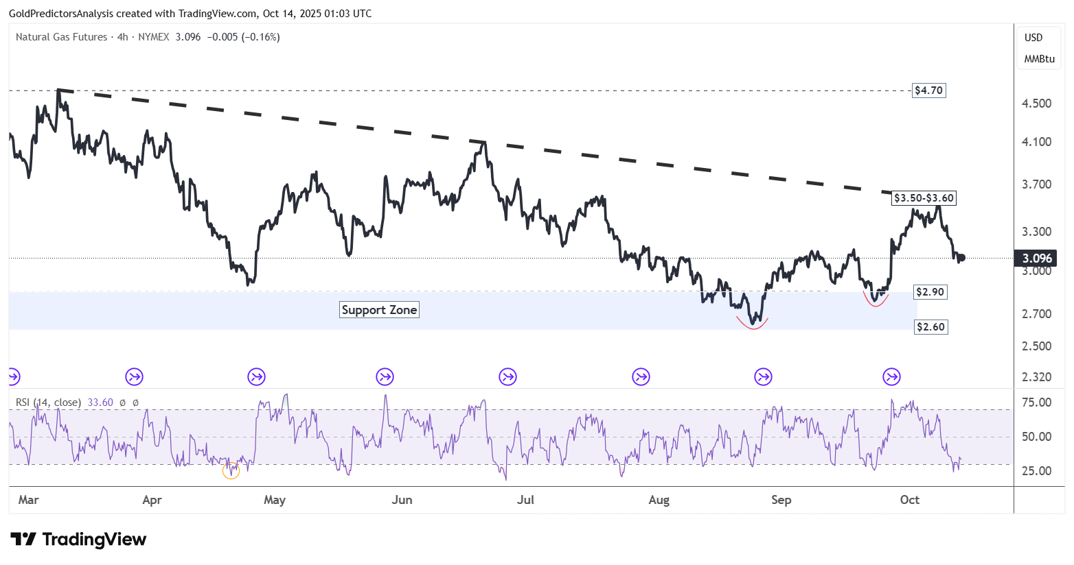 Trên khung 4 giờ, khí tự nhiên đang điều chỉnh giảm sau khi gặp kháng cự quanh vùng 3.50–3.60 USD và hiện đã lùi về gần 2.90 USD. Đường xu hướng giảm chấm đen vẫn đóng vai trò là rào cản chính. Miễn là giá nằm dưới 3.50 USD, thị trường khí tự nhiên nhiều khả năng tiếp tục đi ngang.