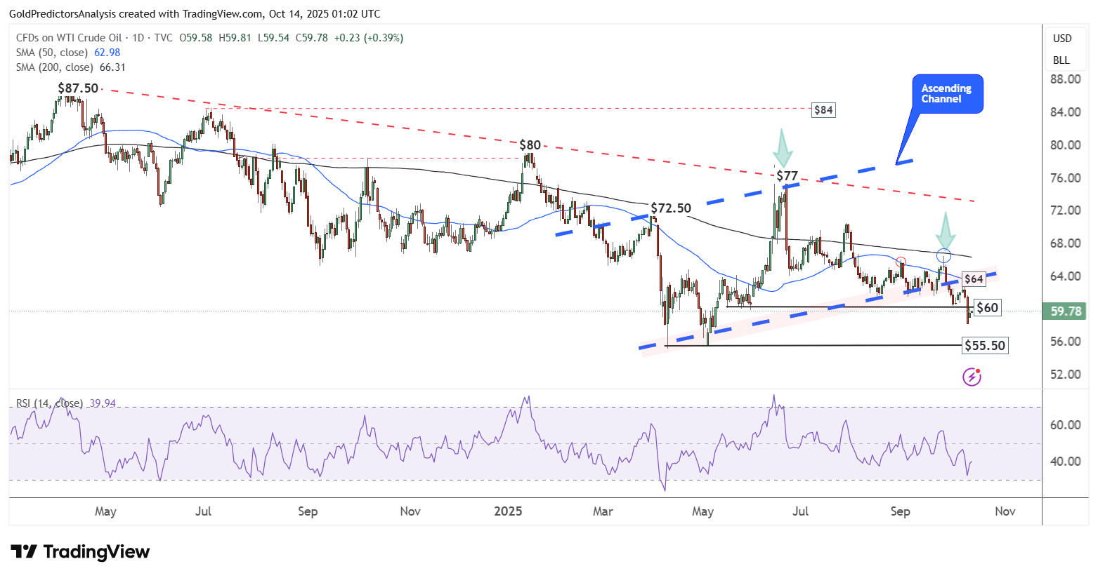 Biểu đồ hàng ngày cho thấy giá dầu thô WTI đã phá vỡ kênh tăng quanh vùng 64 USD và tiếp tục giảm xuống dưới 60 USD, kích hoạt làn sóng bán mới. Đà giảm này có thể kéo giá về mức 55.50 USD. Đường SMA 50 ngày vẫn nằm dưới SMA 200 ngày, xác nhận cấu trúc giảm giá tiếp diễn trong các khung thời gian sắp tới.