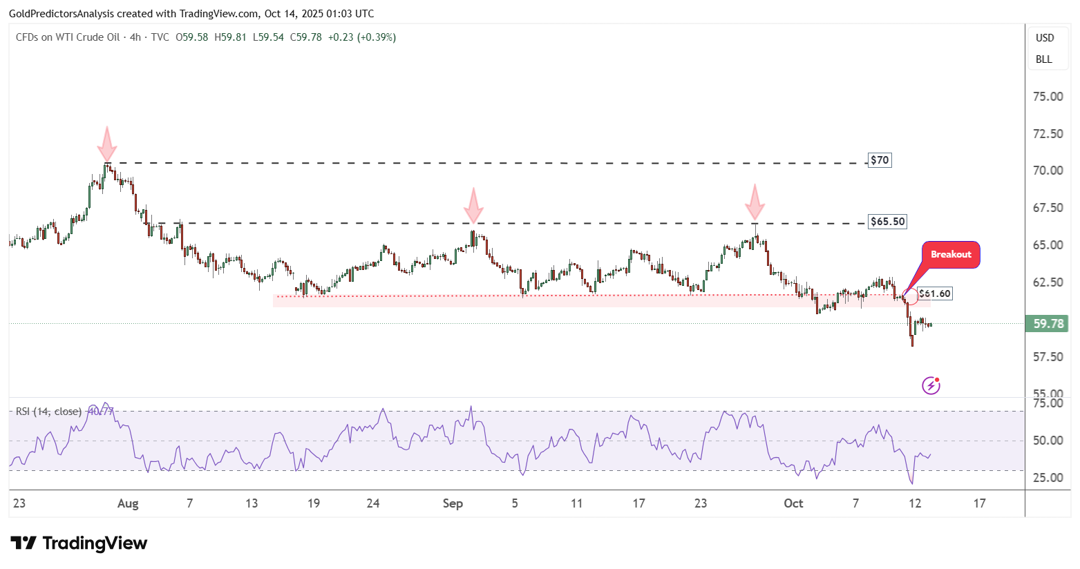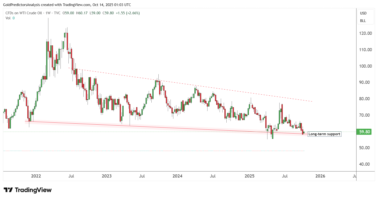 Dù xuất hiện tín hiệu phục hồi nhẹ quanh 60 USD, biểu đồ khung tuần cho thấy giá vẫn nằm trong vùng hỗ trợ mạnh. Một đợt bứt phá rõ ràng chỉ được xác nhận nếu WTI giảm xuống dưới 55 USD, khi đó áp lực bán có thể gia tăng đáng kể.
