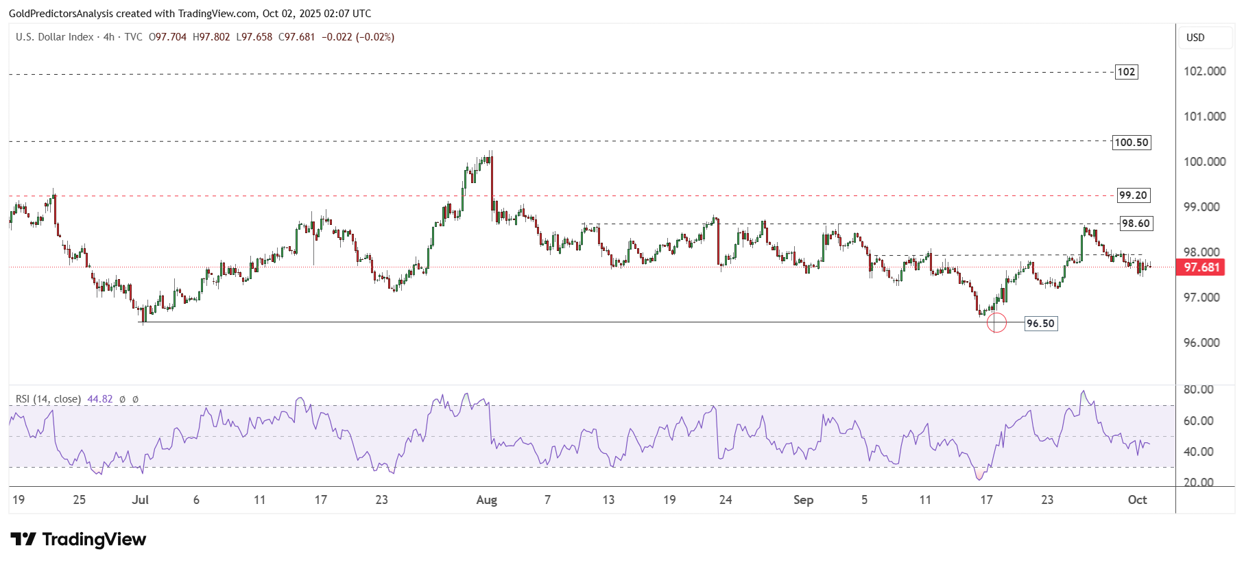 Trên khung 4 giờ, DXY đang củng cố dưới 98.60, dao động trong phạm vi 96.50–100.50. Một cú phá vỡ rõ ràng trên hoặc dưới biên này sẽ quyết định hướng đi tiếp theo của đồng USD.