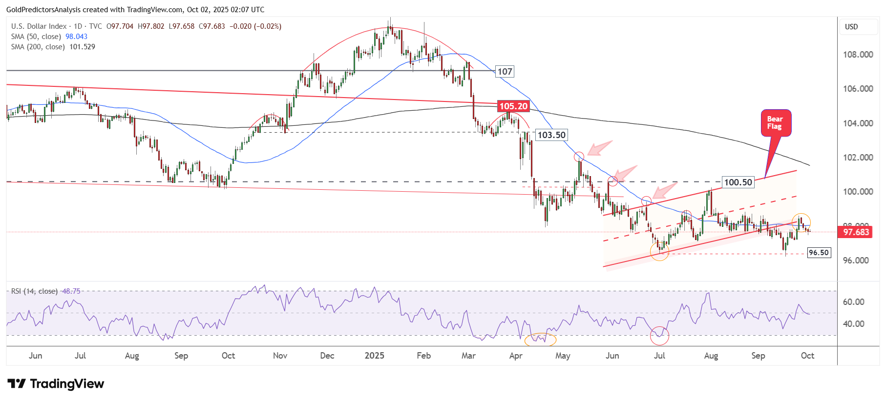 Trên khung ngày, DXY chạm kháng cự của mô hình cờ giảm và sau đó điều chỉnh đi xuống. Việc duy trì dưới đường SMA 50 ngày cho thấy chỉ số nhiều khả năng tiếp tục dao động trong biên hẹp chờ tín hiệu rõ ràng. Nếu phá vỡ hỗ trợ dài hạn tại 96.50, đà giảm sẽ được mở rộng. Ngược lại, bứt phá trên 100.50 sẽ vô hiệu hóa xu hướng giảm và đưa chỉ số lên cao hơn.