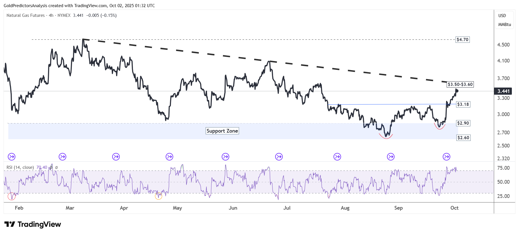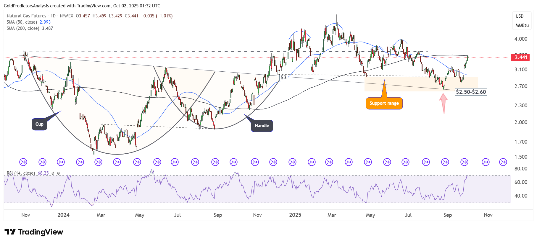 Trên khung ngày, giá khí đốt tự nhiên tìm thấy hỗ trợ vững tại đường cổ của mô hình cốc và tay cầm quanh 2.50–2.60 USD. Nhờ đó, giá phục hồi và đang hướng về đường SMA 200 ngày. Nếu bứt phá thành công, xu hướng tăng sẽ được xác nhận. Mô hình cốc và tay cầm, kết hợp với lực bật từ hỗ trợ, cho thấy khả năng giá tiếp tục đi lên.