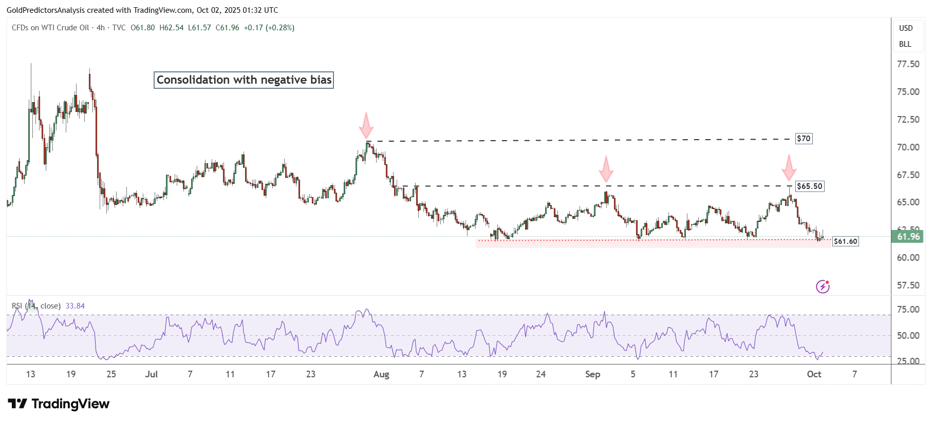 Trên khung 4 giờ, giá WTI dao động trong vùng 60.00–62.00 USD sau khi thất bại vượt 65.50 USD. Điều này phản ánh giai đoạn tích lũy nhưng thiên về xu hướng giảm. Nếu phá vỡ 60.00 USD, áp lực bán có thể được kích hoạt mạnh mẽ.