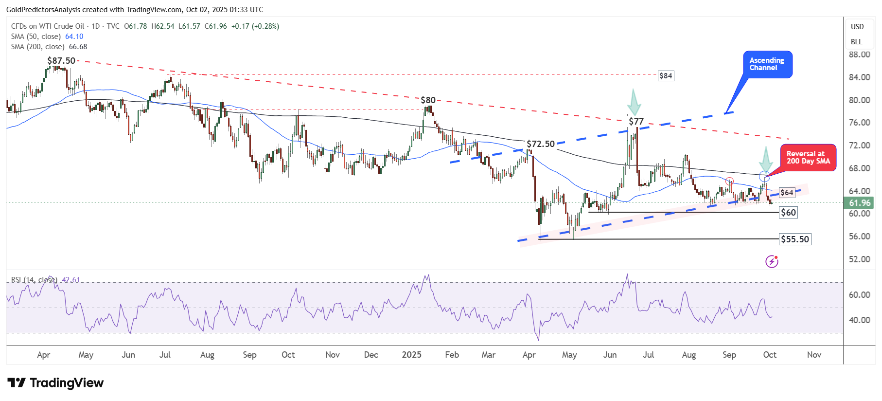 Trên khung ngày, WTI đã xuyên thủng vùng 64 USD sau khi kiểm tra đường SMA 200 ngày. Đây là tín hiệu cho thấy xu hướng giảm có thể tiếp diễn. Hỗ trợ gần nhất nằm ở 60 USD, phá vỡ ngưỡng này sẽ mở ra một đợt lao dốc mới. Chỉ số RSI vẫn dưới mức trung tính, cùng với việc giá nằm dưới SMA 200 ngày, củng cố triển vọng giảm.