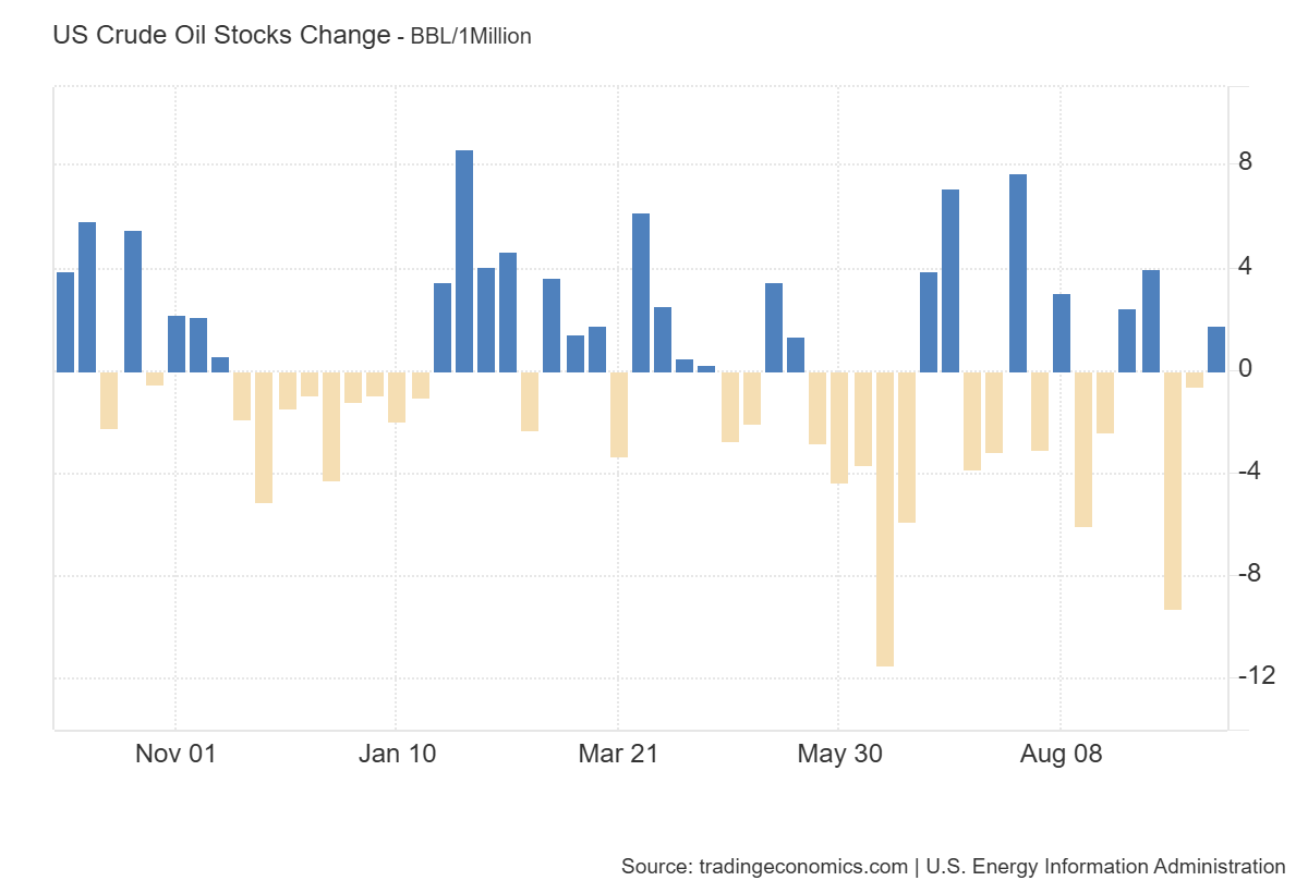 Báo cáo mới nhất của EIA ghi nhận tồn kho dầu thô tăng 1,792 triệu thùng, cao hơn dự báo, sau khi xuất khẩu sụt giảm. Diễn biến này càng làm gia tăng lo ngại dư cung trong bối cảnh nhu cầu thiếu ổn định. Với tồn kho tăng, OPEC+ tranh luận về kế hoạch sản lượng, còn tình trạng đóng cửa chính phủ Mỹ phủ bóng triển vọng, giá dầu nhiều khả năng vẫn yếu và dao động gần đáy trừ khi có cải thiện đáng kể về nhu cầu.