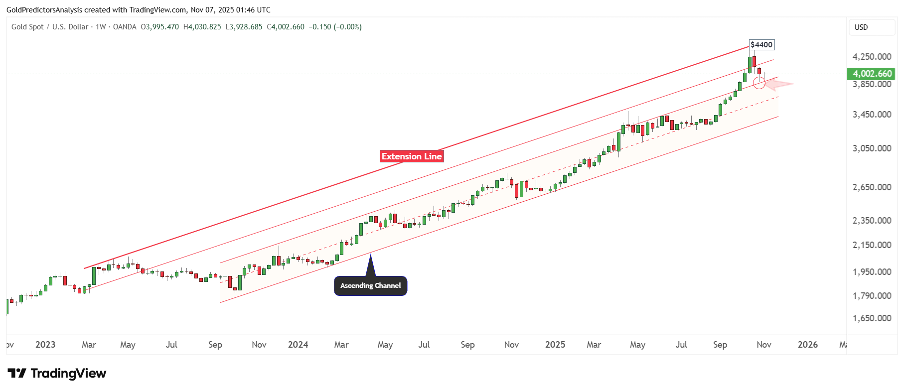 Trên biểu đồ khung tuần, vàng giao ngay đang kiểm tra vùng hỗ trợ mạnh quanh 3,890 USD – trùng với đường biên dưới của mô hình kênh tăng dần. Sau khi chạm vùng này, giá đã tích lũy ổn định và lấy lại đà tăng nhẹ. Nếu giá phá vỡ dưới 3,890 USD, rủi ro giảm về khu vực 3,800–3,700 USD có thể xuất hiện.