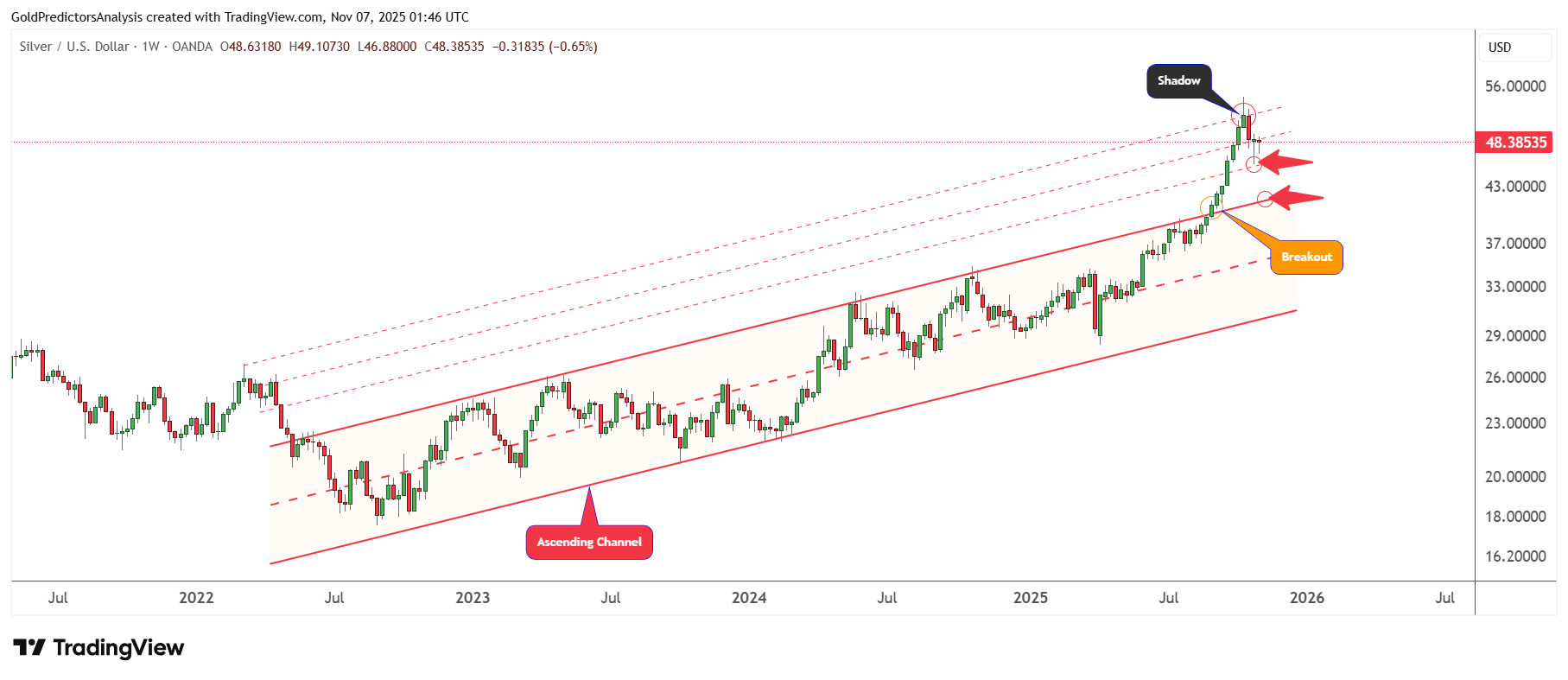 Trên biểu đồ khung tuần, bạc (XAG) giao ngay đang tích lũy quanh vùng hỗ trợ mạnh 45.50 USD – được xem là nền giá quan trọng trong xu hướng tăng dài hạn.