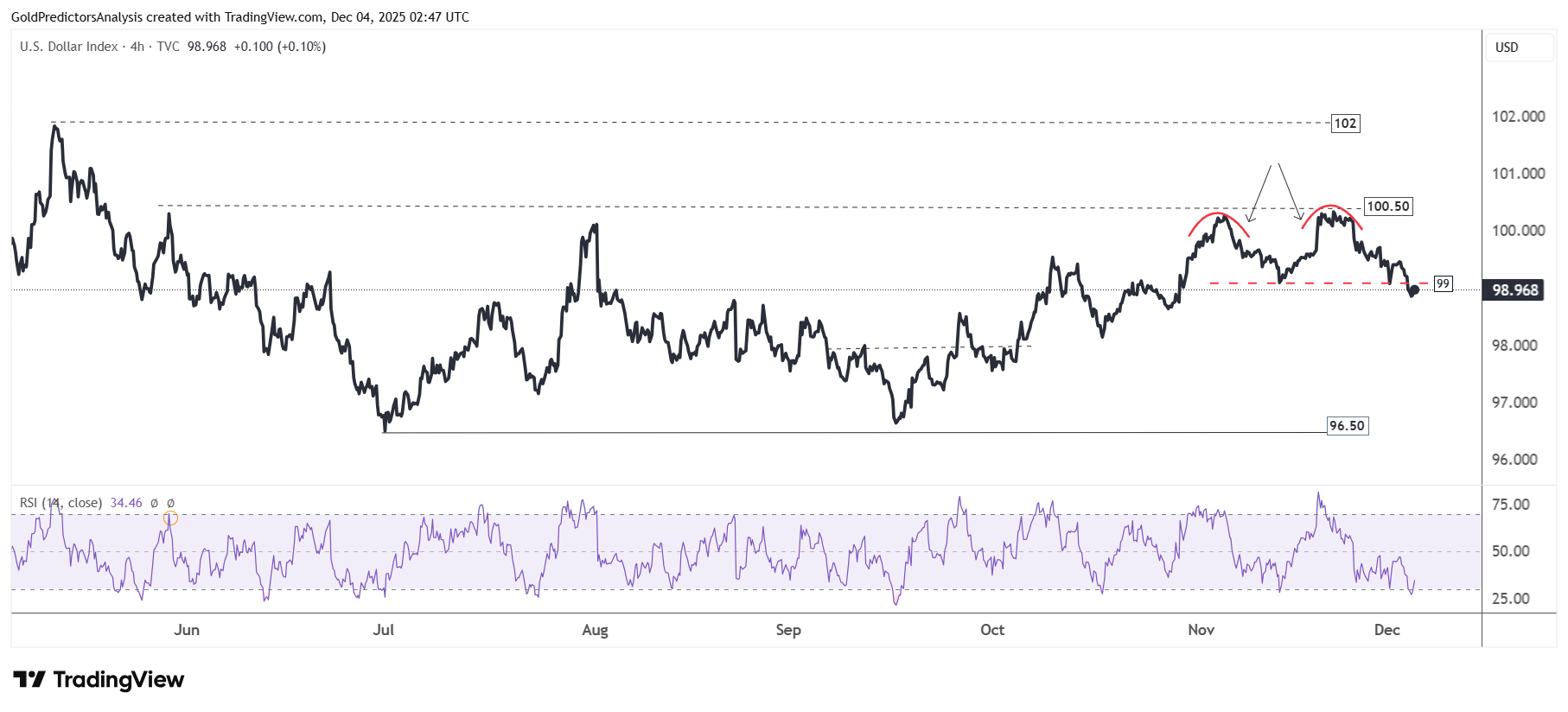 Biểu đồ khung giờ của USD Index cho thấy chỉ số đã phá xuống dưới vùng 99, vốn đóng vai trò là đường cổ của mô hình hai đỉnh. Việc hình thành hai đỉnh quanh 100.50 cho thấy áp lực giảm mạnh. Mẫu hình này làm tăng khả năng giá tiếp tục giảm về vùng 98. Nếu phá vỡ dứt khoát dưới 98, triển vọng giảm sẽ được củng cố và mở ra dư địa giảm sâu về vùng 96.50.