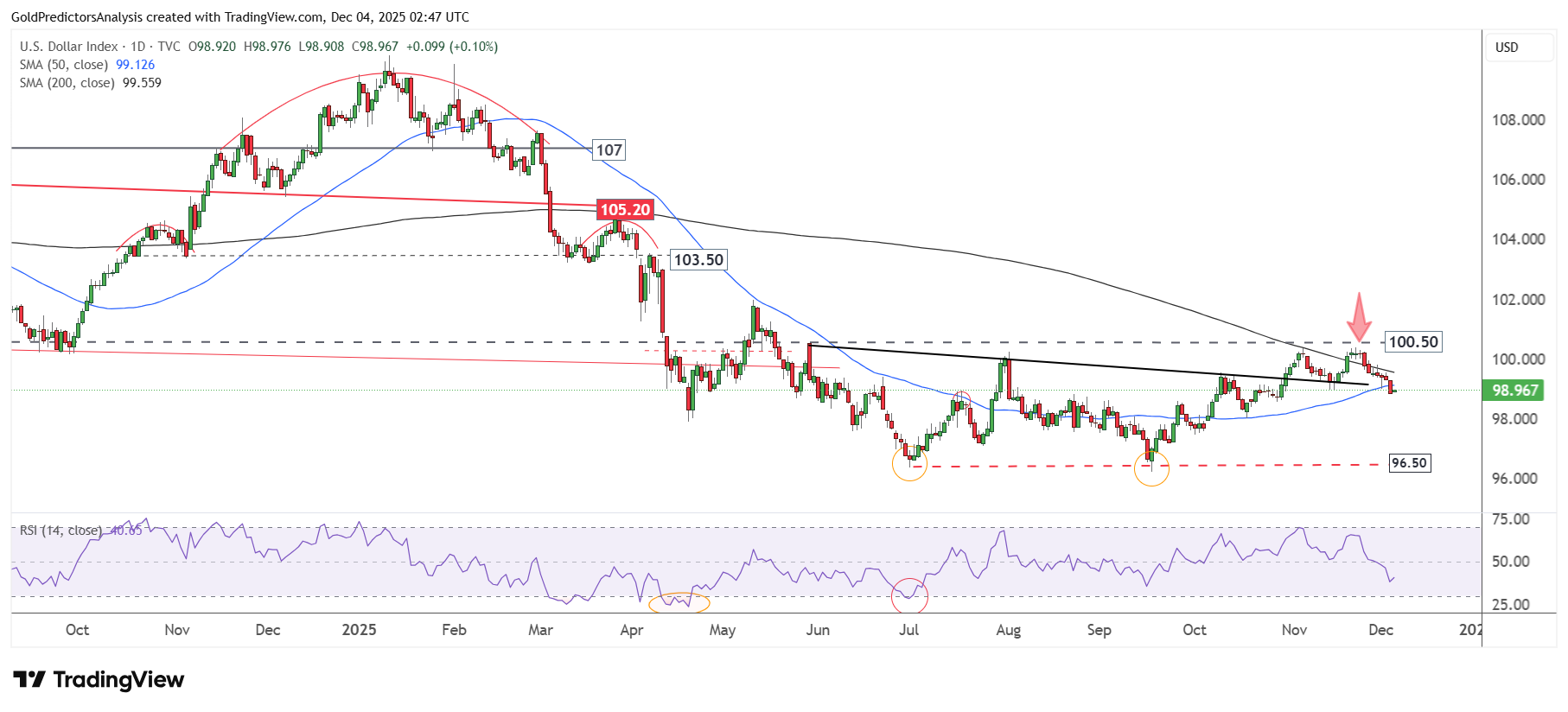 Biểu đồ khung ngày của chỉ số USD cho thấy xu hướng giảm tiếp tục duy trì dưới mốc 99. Diễn biến này xuất hiện sau lần thất bại khi cố gắng vượt kháng cự 100.50. Giá cũng đã giảm xuống dưới SMA 50 ngày. Cú phá vỡ này làm gia tăng khả năng giảm sâu hơn về vùng 96.50. Đồng thời, RSI duy trì dưới vùng trung tính, củng cố áp lực giảm trong ngắn hạn.