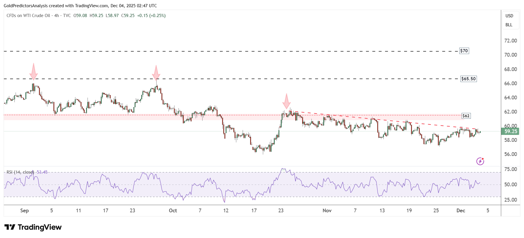 Biểu đồ khung giờ cho thấy dầu WTI đang tích lũy dưới đường xu hướng nét đứt màu đỏ. Khi giá duy trì dưới $62, khả năng xuất hiện một nhịp giảm mạnh tiếp tục duy trì ở mức cao.
