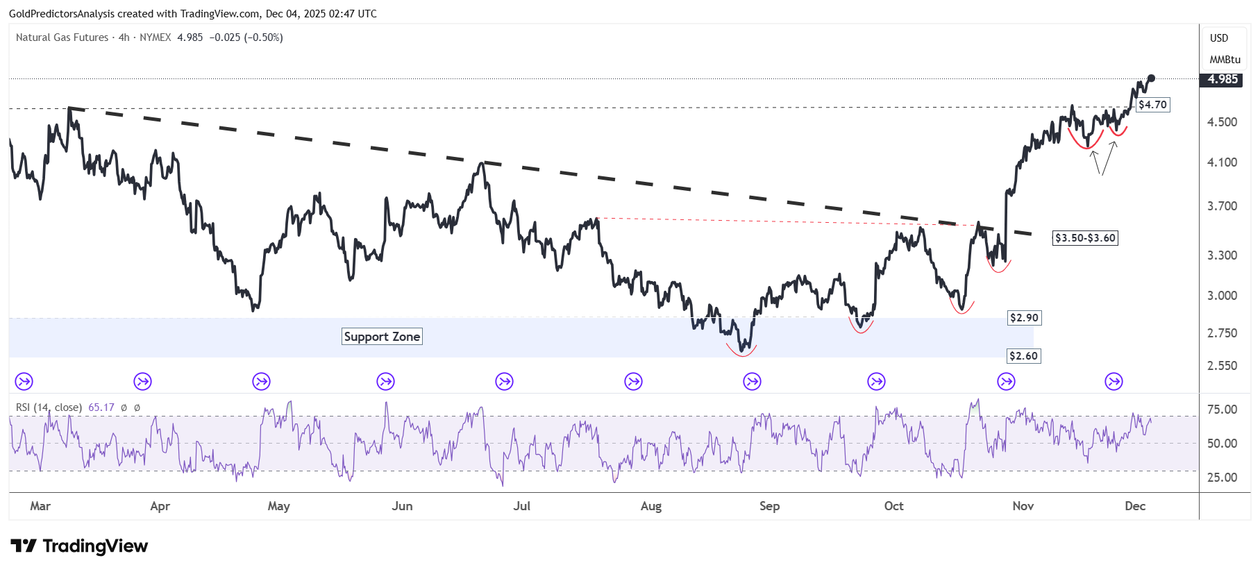 Biểu đồ khung giờ của khí tự nhiên cho thấy giá đã vượt lên vùng $4.70 sau khi hình thành cấu trúc giá tăng trên khu vực $4.10. Nhiều nhịp đảo chiều từ vùng hỗ trợ $2.60 đã tạo nền vững cho giá khí. Cú bứt phá lên trên đường xu hướng nét đứt màu đen quanh $3.50 xác nhận động lượng tăng bền vững. Các tín hiệu này cho thấy khả năng tăng tiếp tục mở rộng trong những ngày tới.