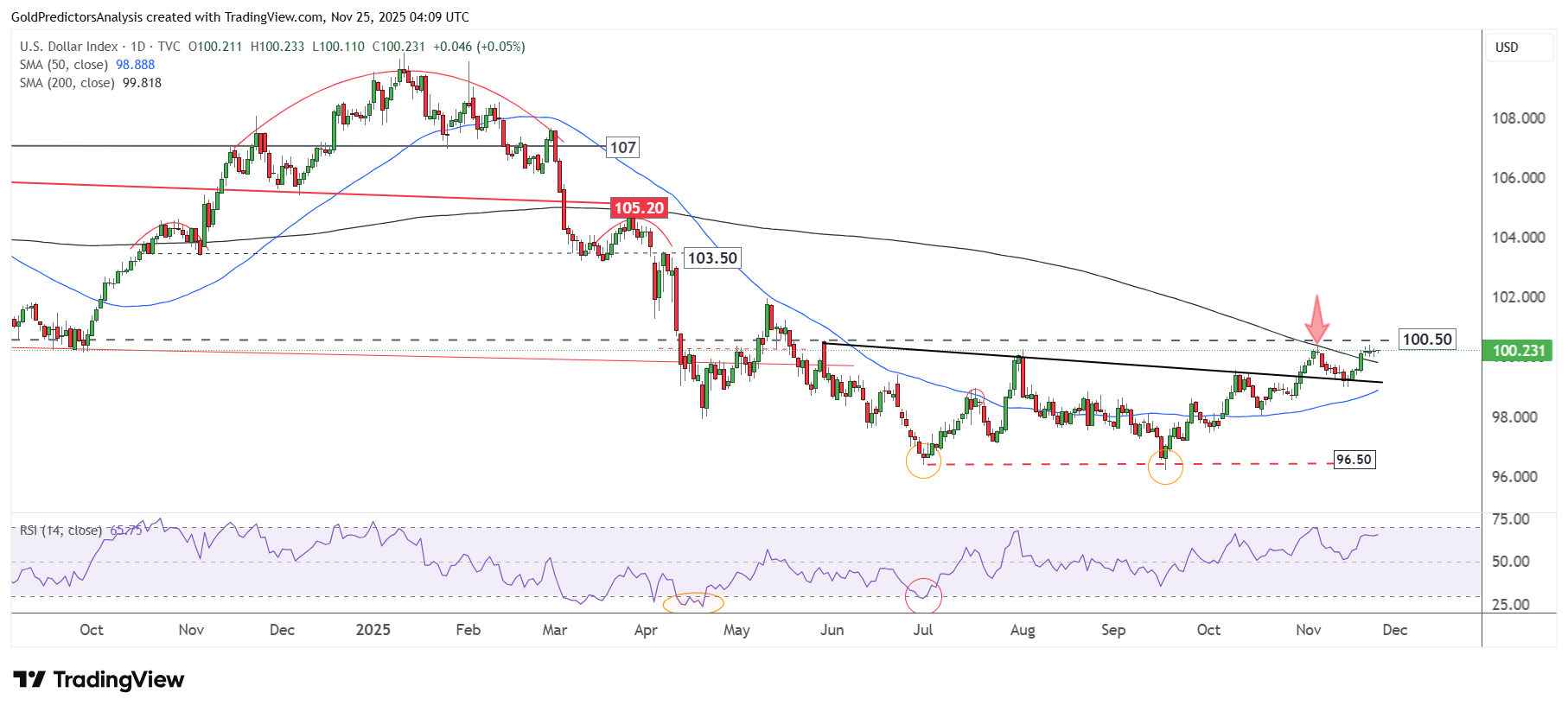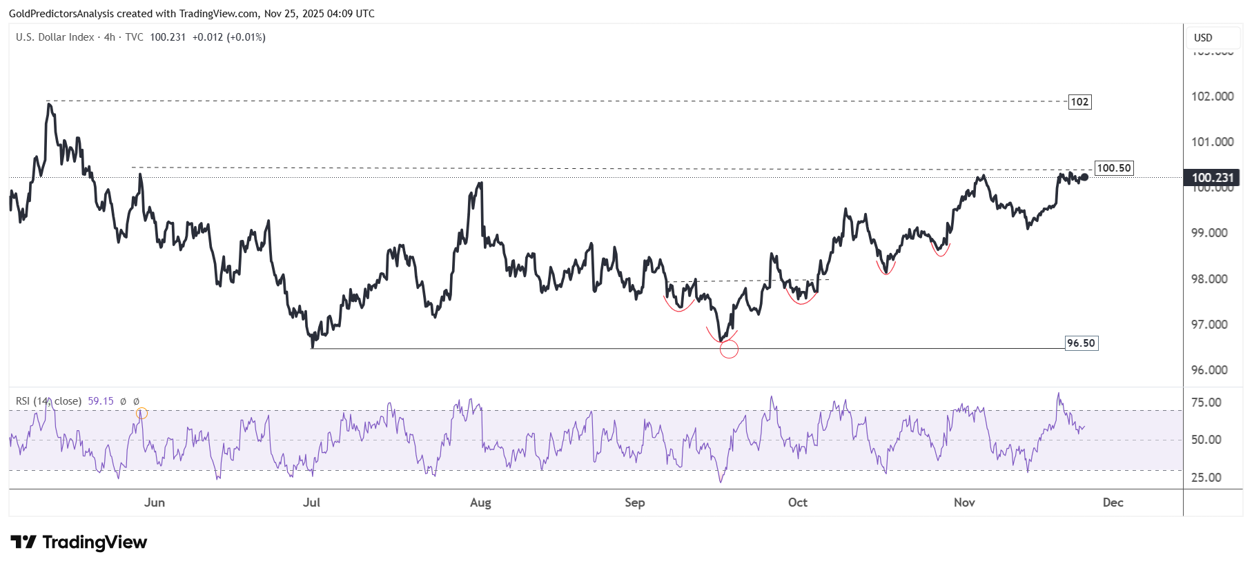 Biểu đồ 4 giờ của chỉ số USD cho thấy sự củng cố kéo dài giữa vùng 96.50 và 100.50 kể từ tháng 6 năm 2025. Nếu phá lên trên 100.50, chỉ số có thể hướng về 102. Ngược lại, nếu giảm xuống dưới 98, thị trường có thể đối mặt với nhịp giảm hướng về hỗ trợ 96.50.