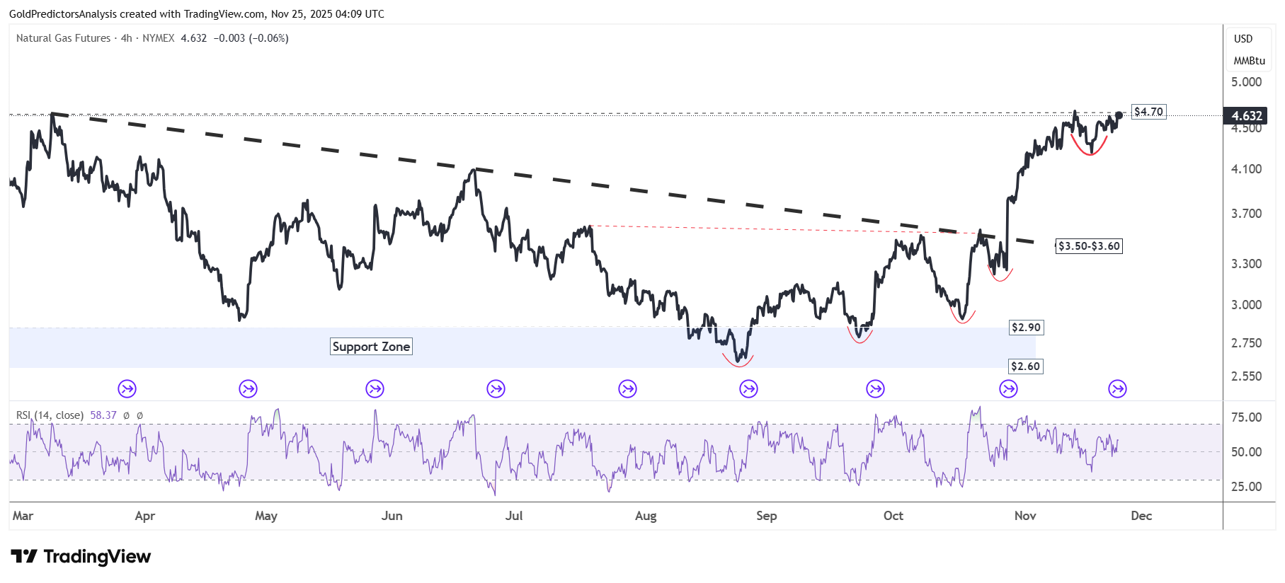 Biểu đồ 4 giờ cho thấy khí tự nhiên đang củng cố vững trên vùng $4.10, với nỗ lực liên tục nhằm phá vỡ vùng $4.70. Nếu phá được vùng này, giá có thể bước vào một nhịp tăng mạnh khác. Sự xuất hiện của nhiều mô hình tăng giá tiếp tục xác nhận động lực tăng. Ngoài ra, việc phá vỡ đường xu hướng chấm đen quanh $3.50 càng củng cố khả năng duy trì xu hướng tăng.