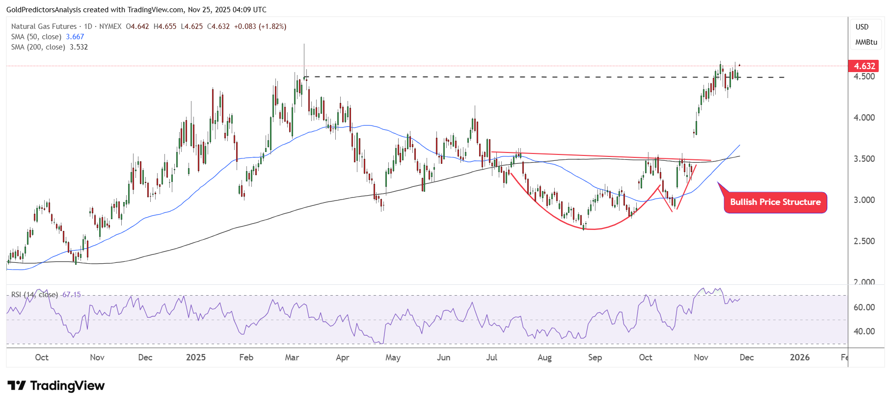 Biểu đồ ngày của khí tự nhiên (NG) cho thấy sự củng cố ổn định giữa vùng $4.30 và $4.70, được xác định bởi đường xu hướng chấm đen. Diễn biến trong phạm vi này làm tăng khả năng phá vỡ tăng tại vùng $4.70.