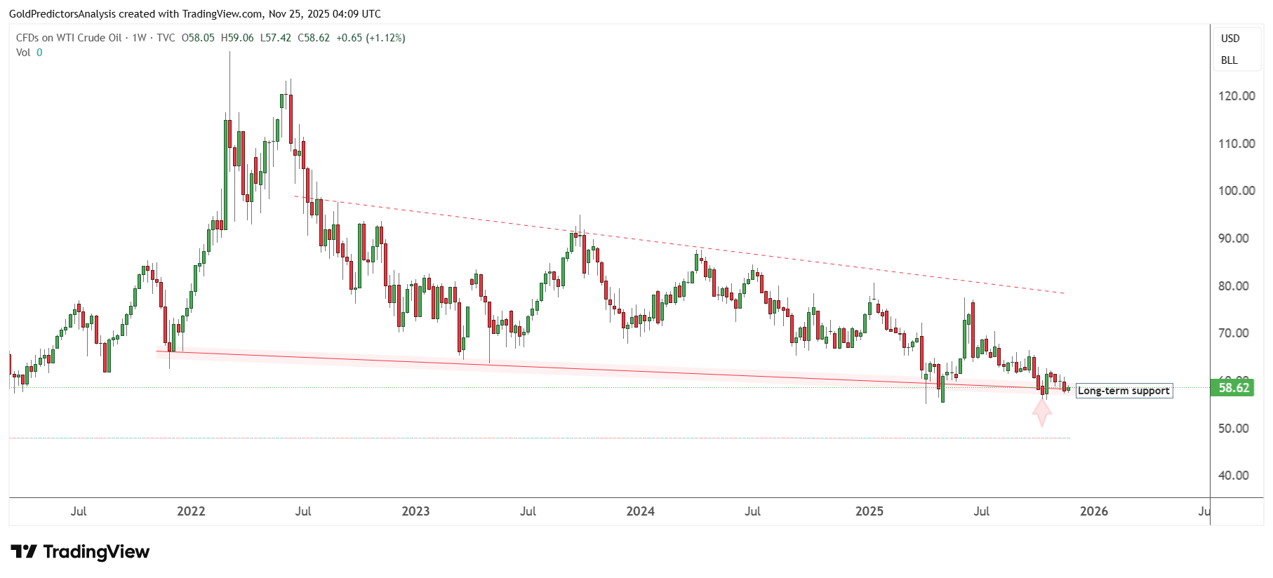 Bất chấp các lệnh trừng phạt duy trì và chưa có tiến triển trong đàm phán hòa bình Ukraine–Nga, kỳ vọng dư thừa dầu từ năm 2026 đang gây áp lực rõ rệt lên giá. Tuy nhiên, áp lực giảm được hạn chế phần nào nhờ kỳ vọng Fed có thể cắt giảm lãi suất vào tháng 12. Các quan chức Fed đang phát tín hiệu nghiêng về nới lỏng, yếu tố có thể cải thiện hoạt động kinh tế và nâng nhu cầu năng lượng. Bối cảnh vĩ mô này giúp thu hẹp đà giảm và có thể tạm thời hỗ trợ giá dầu thô, bất chấp triển vọng nguồn cung nghiêng về giảm giá.