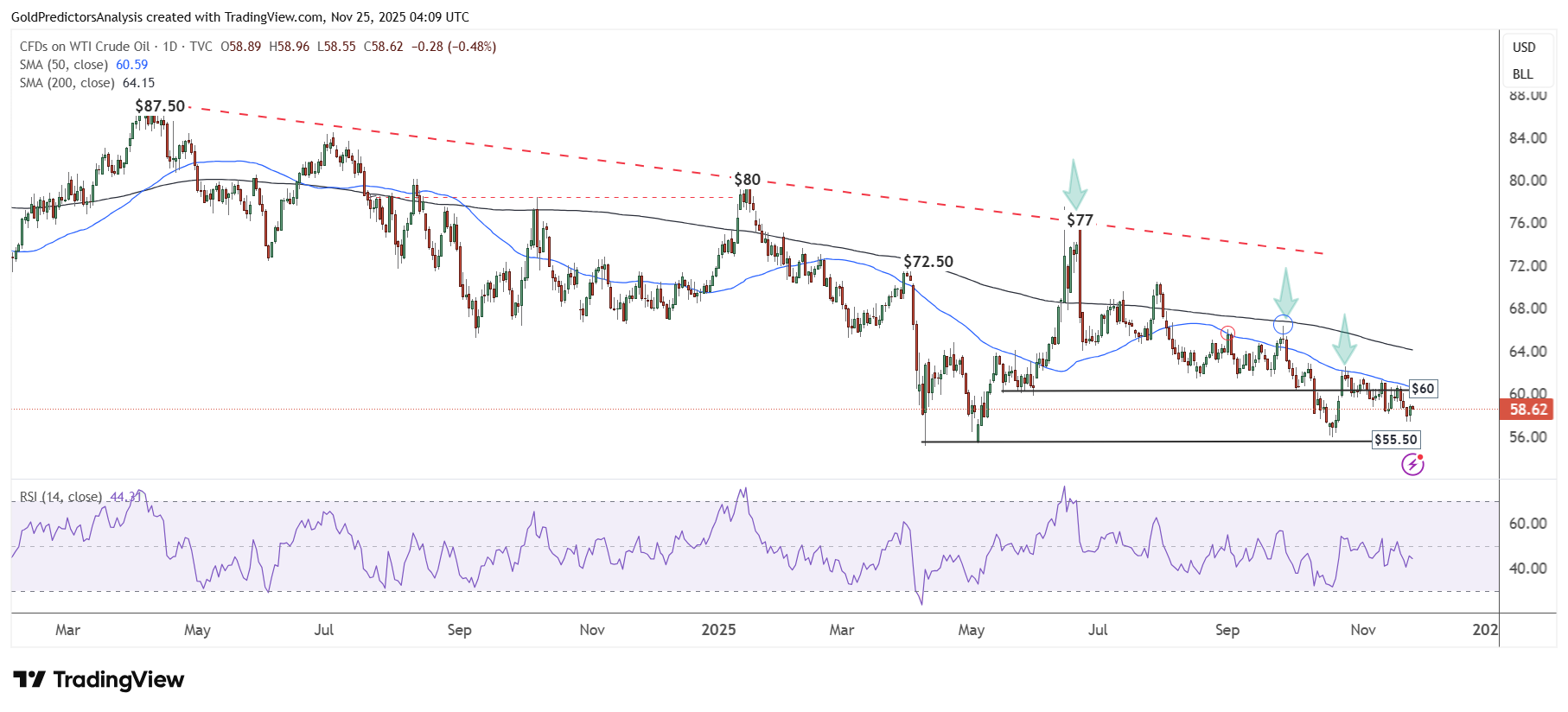 Biểu đồ ngày của dầu thô WTI cho thấy áp lực giảm rõ rệt khi giá giao dịch dưới cả SMA 50 ngày và SMA 200 ngày. Mốc $60 đang đóng vai trò là kháng cự ngắn hạn quan trọng, được củng cố bởi đường SMA 50 ngày. Chừng nào giá còn dưới mức này, đà giảm vẫn chiếm ưu thế. Đồng thời, RSI duy trì dưới vùng trung tính, tiếp tục củng cố thiên hướng giảm trên thị trường.