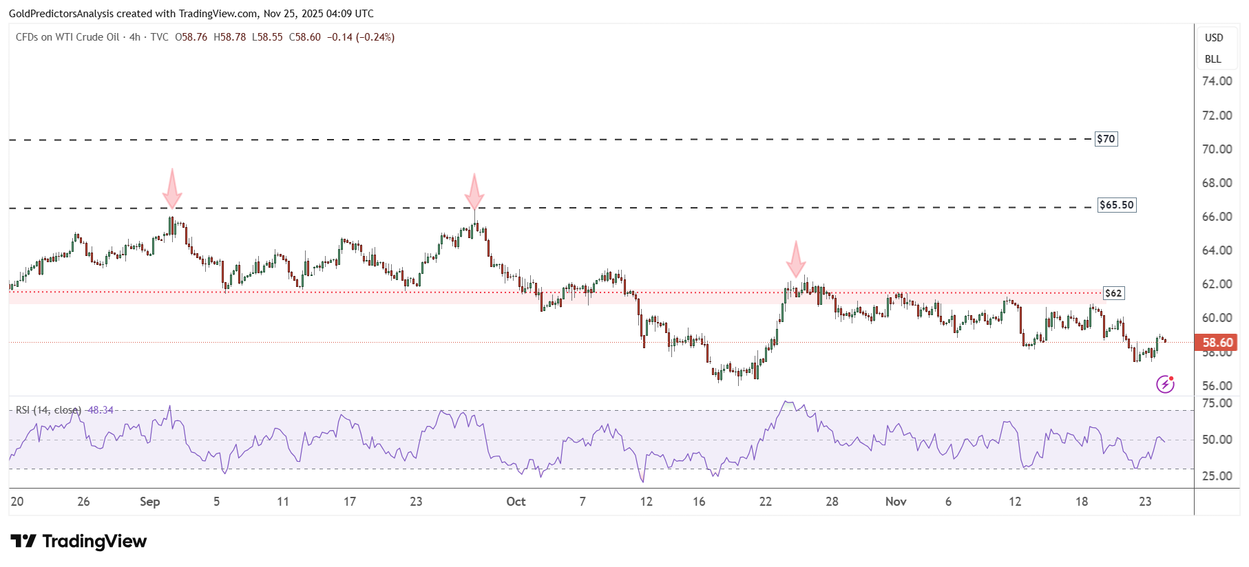 Biểu đồ 4 giờ của dầu WTI cho thấy sự củng cố mạnh dưới vùng $62, phản ánh áp lực giảm duy trì. Nếu giá phá vỡ lên trên $62, điều này có thể kích hoạt nhịp tăng hướng tới $65. Ngược lại, nếu phá xuống dưới $55, thị trường có thể đối mặt với một làn sóng bán mới.