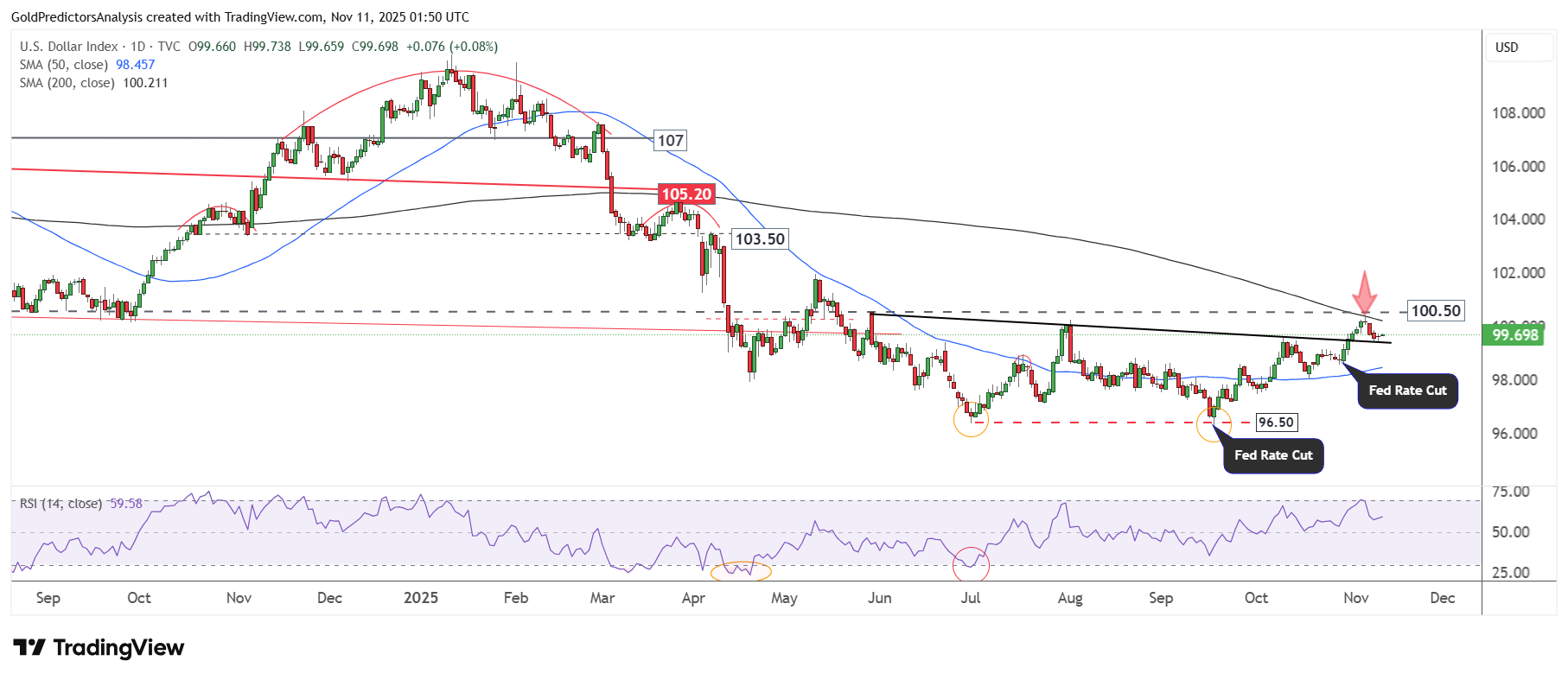 Biểu đồ khung ngày của chỉ số DXY cho thấy chỉ số đang củng cố dưới đường trung bình 200 ngày quanh 100.50. Miễn là DXY chưa vượt được mốc này, xu hướng tổng thể vẫn mang tính tiêu cực.