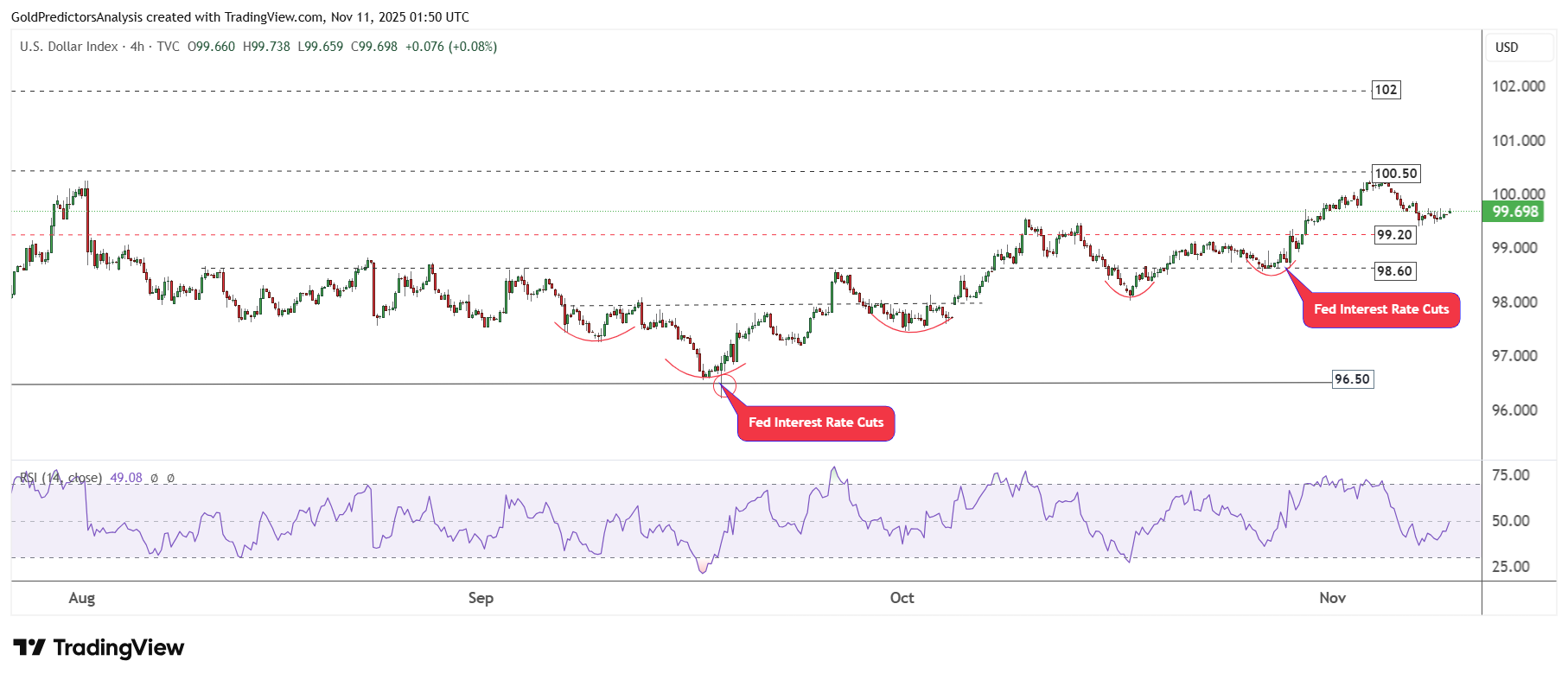 Biểu đồ khung 4 giờ của DXY cho thấy chỉ số đang dao động trong phạm vi 96.50–100.50. Hiện DXY đã tiến đến vùng trên của phạm vi, tại 100.50, và có thể tiếp tục tích lũy trước khi điều chỉnh về vùng hỗ trợ 98.60. Nếu vượt qua 100.50, chỉ số có thể hướng tới 102.