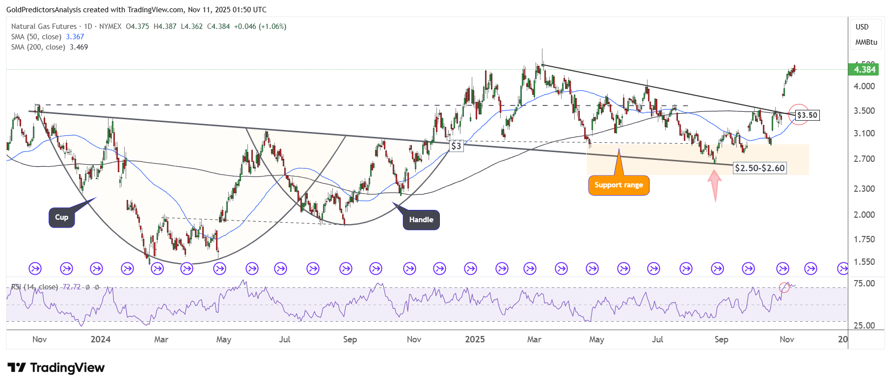 Nếu giá bứt phá qua vùng 4.50 USD, đà tăng có thể được mở rộng hơn nữa. Tuy nhiên, nếu điều chỉnh về 3.50 USD, đây sẽ được xem là vùng mua tiềm năng cho chu kỳ tăng kế tiếp. Dù triển vọng chung vẫn tích cực, chỉ báo RSI đang tiến vào vùng quá mua, cho thấy khả năng xuất hiện nhịp điều chỉnh ngắn hạn.