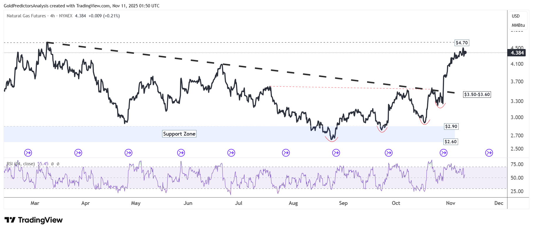 Trên khung 4 giờ, giá khí tự nhiên đã bứt phá qua đường xu hướng giảm chấm đen quanh vùng 3.50–3.60 USD và hiện đang hướng tới 4.70 USD. Phá vỡ này phản ánh hành động giá mang thiên hướng tăng trong ngắn hạn. Nếu vượt mốc 4.70 USD, giá có thể tiếp tục mở rộng đà tăng. Ngược lại, các nhịp điều chỉnh nên được xem là cơ hội mua vào cho nhà giao dịch ngắn hạn.