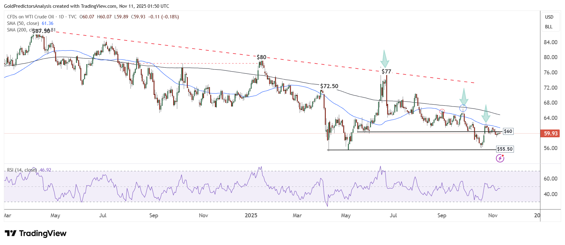 Biểu đồ khung ngày của dầu WTI cho thấy giá đang tích lũy dưới vùng 60 USD, chờ đợi tín hiệu rõ ràng cho xu hướng kế tiếp. Mặc dù có sự phục hồi vào thứ Hai, xu hướng tổng thể vẫn là giảm, khi giá duy trì dưới các đường trung bình động 50 ngày và 200 ngày.