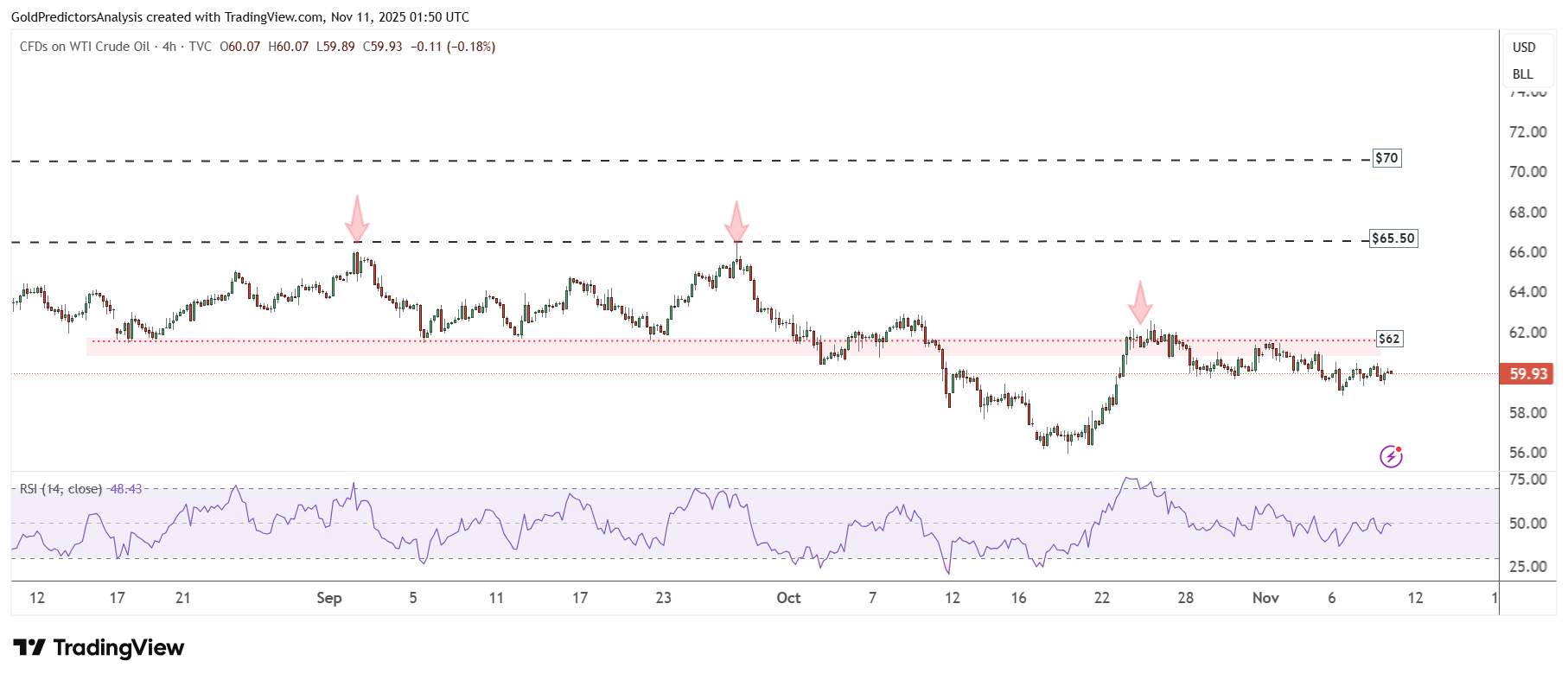 Chỉ báo RSI vẫn nằm dưới mức trung tính, phản ánh động lực giảm tiếp tục chiếm ưu thế. Nếu giá vượt mốc 62.50 USD, khả năng tăng sẽ mở rộng lên vùng đường trung bình 200 ngày quanh 65 USD. Ngược lại, nếu giá phá xuống dưới vùng 59 USD, xu hướng giảm có thể kéo dài về 55.50 USD.