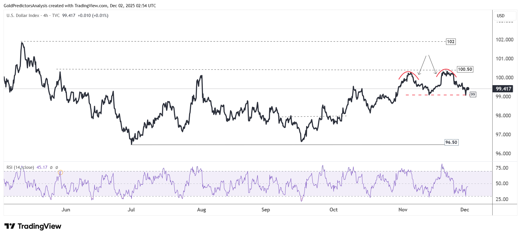 Biểu đồ khung 4 giờ của DXY cho thấy mô hình hai đỉnh hình thành gần kháng cự 100.50. Một phá vỡ dưới 99 sẽ gợi ý đà giảm ngắn hạn hướng về 98 và 96.50. Miễn là giá nằm dưới 100.50, xu hướng kế tiếp của USD nhiều khả năng là giảm.