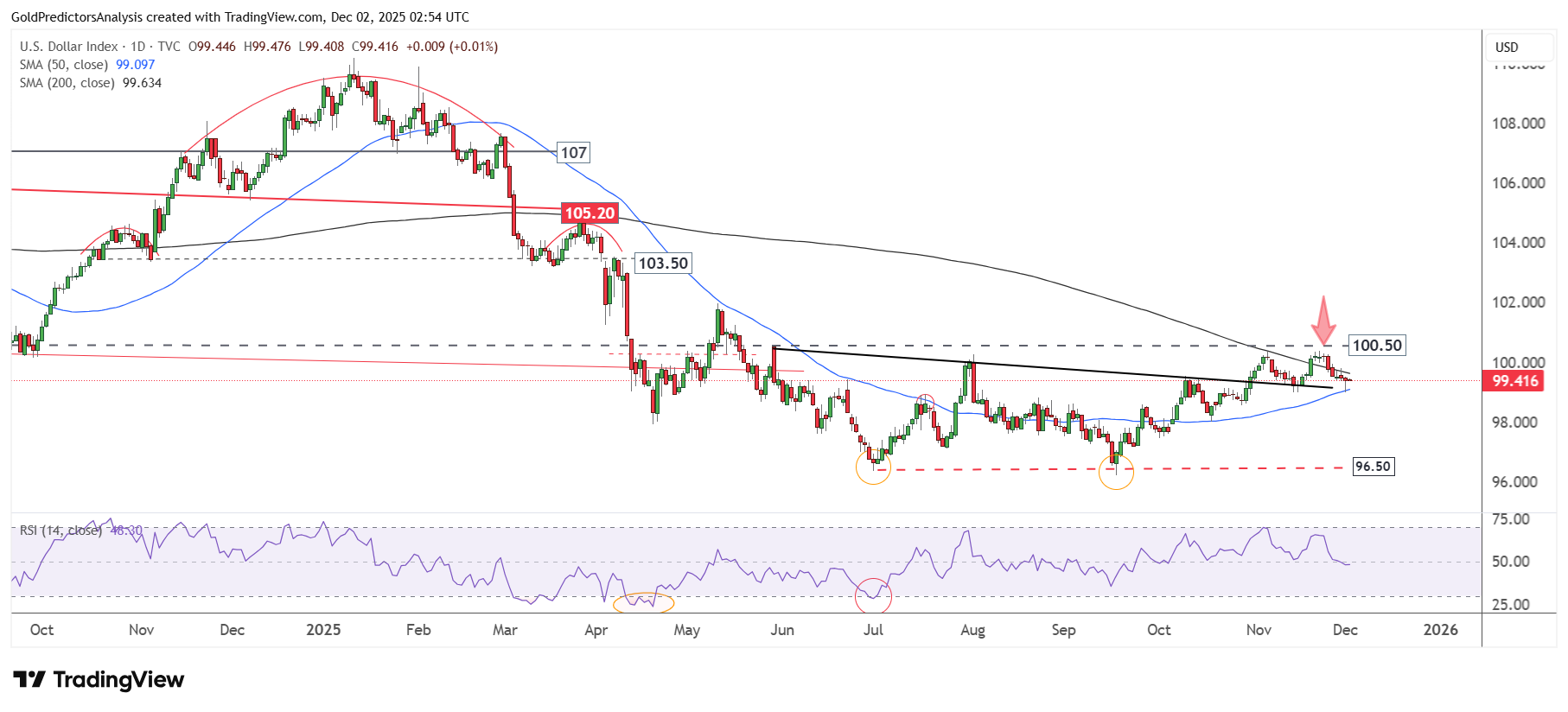 Một phá vỡ dưới SMA 50 ngày gần mốc 99 sẽ báo hiệu đà giảm tiếp theo hướng về 96.50. Ngược lại, vượt 100.50 sẽ cho thấy khả năng tiếp tục tăng.