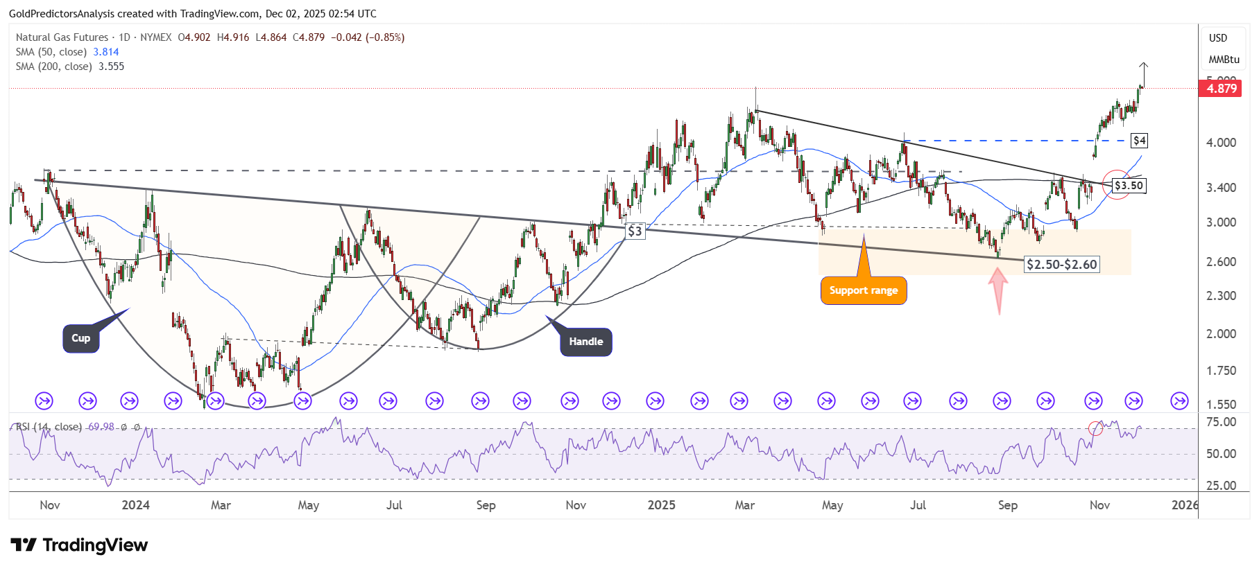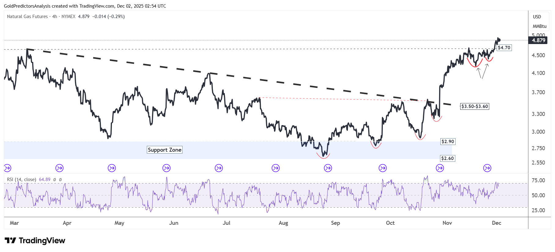 Biểu đồ khung 4 giờ của khí tự nhiên cho thấy một cú bứt phá mạnh trên vùng $4.70, thể hiện hành động giá tích cực và vững chắc. Miễn là giá giữ được hỗ trợ $4.70, đà tăng có thể duy trì. Sự xuất hiện của loạt mô hình tăng gần $2.50, sau đó là cú phá vỡ trên $3.50, đã mở đường cho xu hướng tăng tiếp diễn.