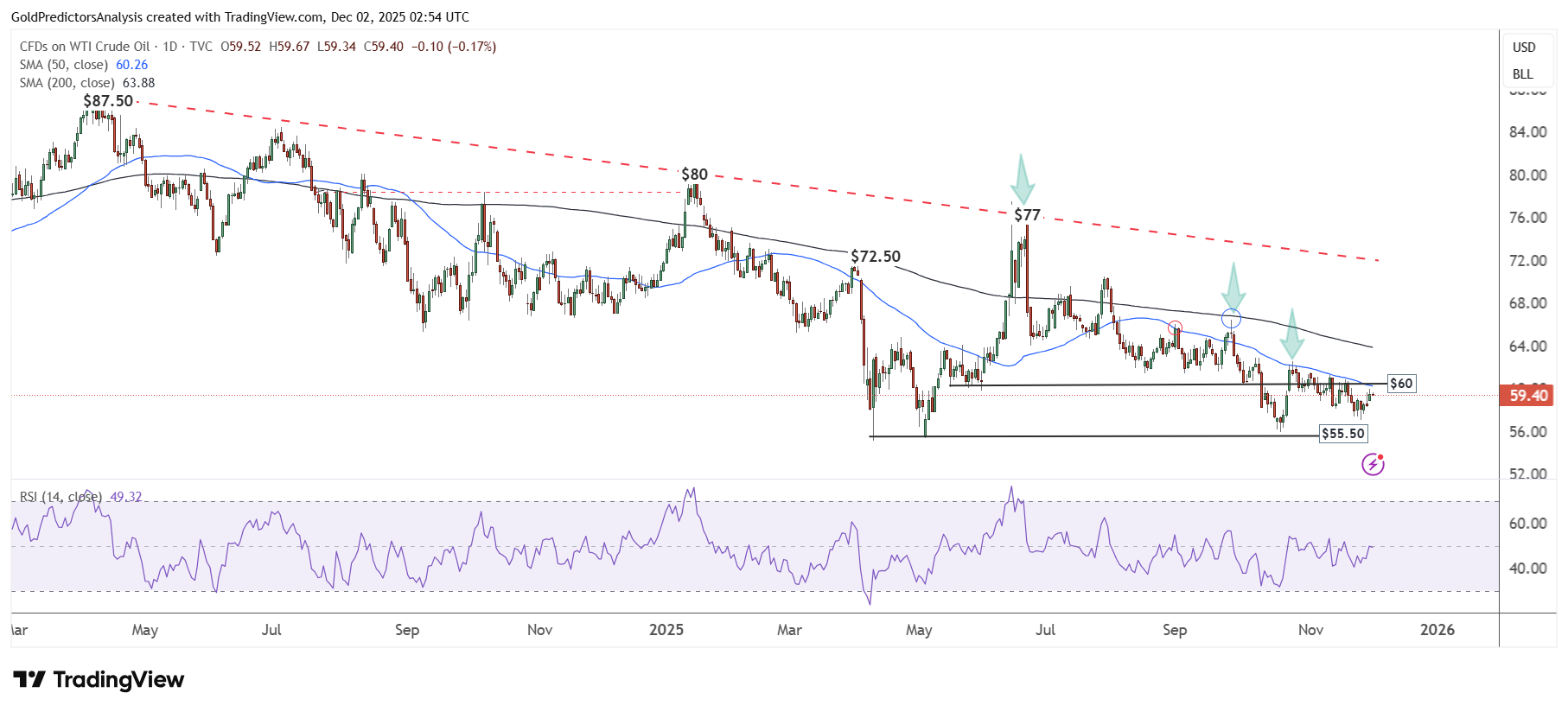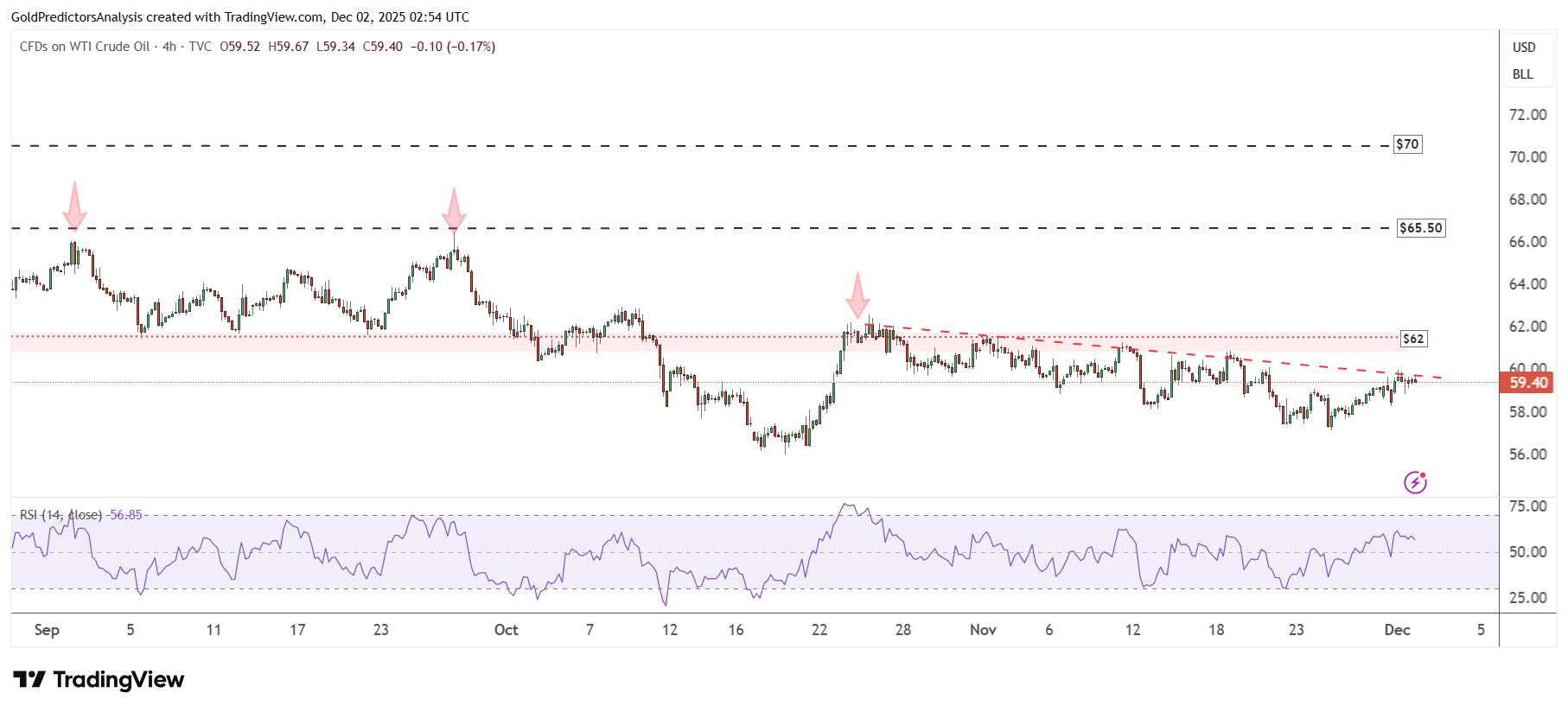 Biểu đồ khung 4 giờ của WTI cho thấy giá đang củng cố dưới đường xu hướng chấm đỏ gần $60. Một phá vỡ trên $60 sẽ gợi ý đà tăng hướng tới $62. Dù vậy, nhịp củng cố gần đây phản ánh sự thiếu rõ ràng về xu hướng, và hành động giá dưới $62 tiếp tục củng cố tông màu tiêu cực của thị trường dầu.