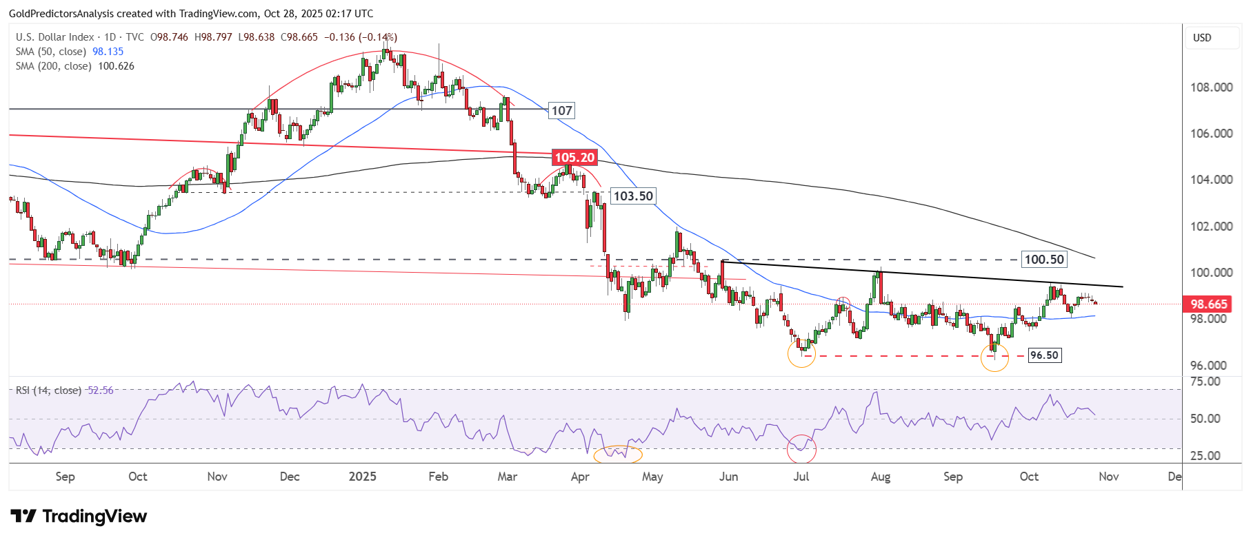 Biểu đồ khung ngày của DXY cho thấy chỉ số đang hợp nhất quanh vùng 96.50 trong biên độ hẹp, phản ánh tâm lý thận trọng trước quyết định lãi suất sắp tới của Fed. Biến động lớn tiếp theo nhiều khả năng sẽ được kích hoạt sau khi Fed công bố chính sách và những tiến triển trong đàm phán thương mại Mỹ - Trung.