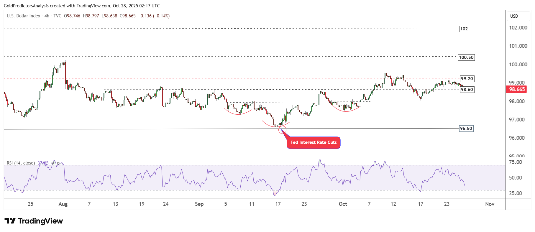 Trên khung 4 giờ, DXY tiếp tục dao động trong vùng 96.50–100.50. Mức hợp nhất này cho thấy thị trường đang chờ đợi một chất xúc tác quan trọng để xác định hướng đi kế tiếp.