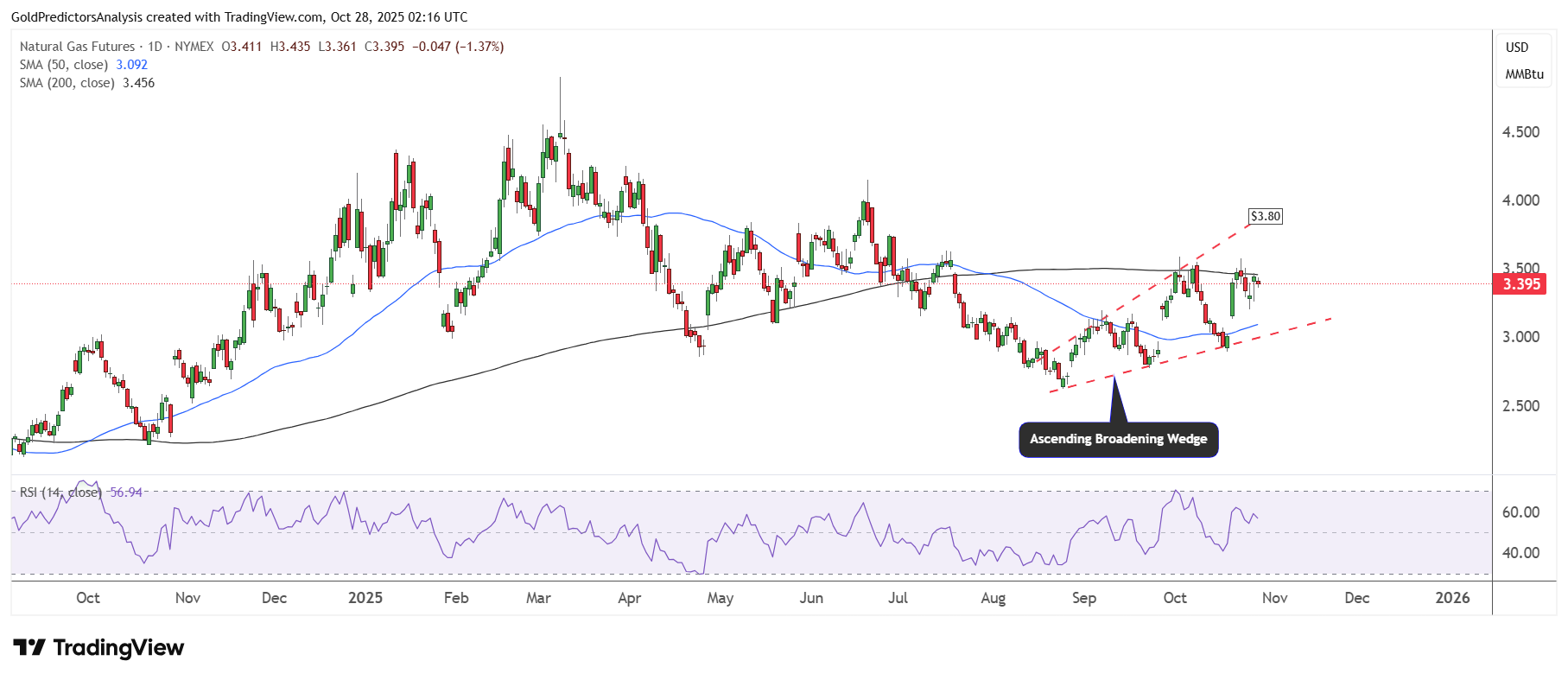 Biểu đồ khung ngày cho thấy khí tự nhiên đang giao dịch trong mô hình nêm mở rộng tăng dần, thể hiện biến động mạnh. Giá hiện đang dao động giữa các đường SMA 50 ngày và SMA 200 ngày, cho thấy trạng thái nén.