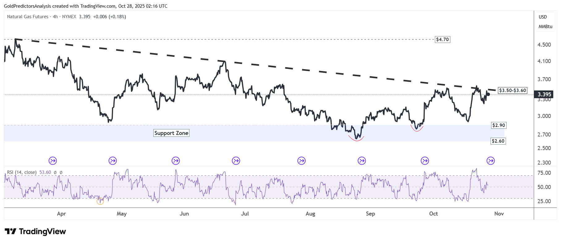 Trên khung 4 giờ, khí tự nhiên đang hợp nhất trong vùng 3.50–3,60 USD, ngay dưới đường xu hướng giảm. Đà hồi phục từ vùng hỗ trợ 2.60–2,90 USD đã giúp giá giữ ổn định quanh vùng này. Việc phá vỡ trên 3.60 USD có thể kích hoạt một nhịp tăng tiếp theo, với mục tiêu trong khoảng 4.10–4,70 USD.