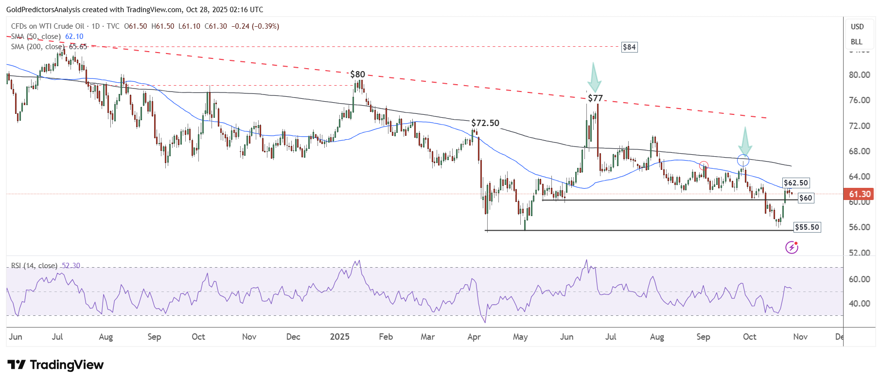 Biểu đồ khung ngày của dầu WTI cho thấy giá đã hồi phục từ vùng hỗ trợ dài hạn quanh 56 USD và hiện đang thử thách vùng kháng cự mạnh gần đường SMA 50 ngày. Khu vực kháng cự này nằm trong khoảng 62–65 USD, trùng với đường SMA 200 ngày.